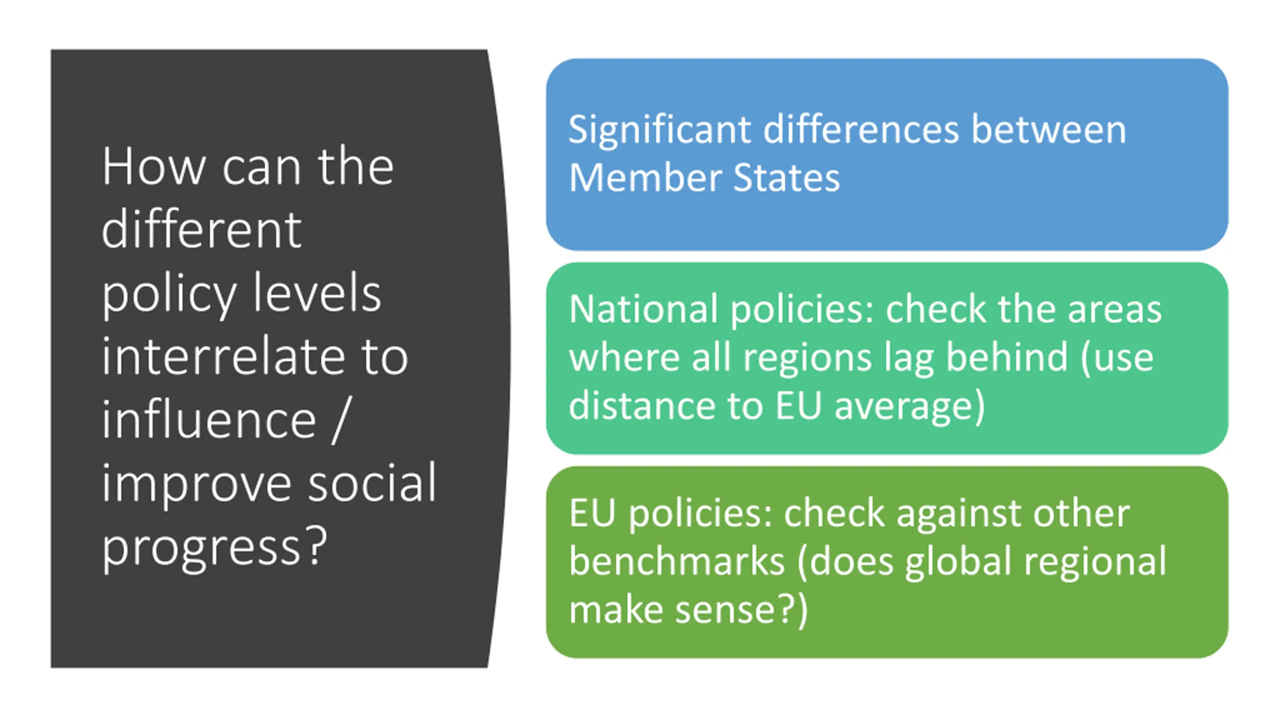 Significant differences between Member States How can the different policy levels interrelate to influence / improve social progress? National policies: check the areas where all regions lag behind (use distance to EU average) EU policies: check against other benchmarks (does global regional make sense?)