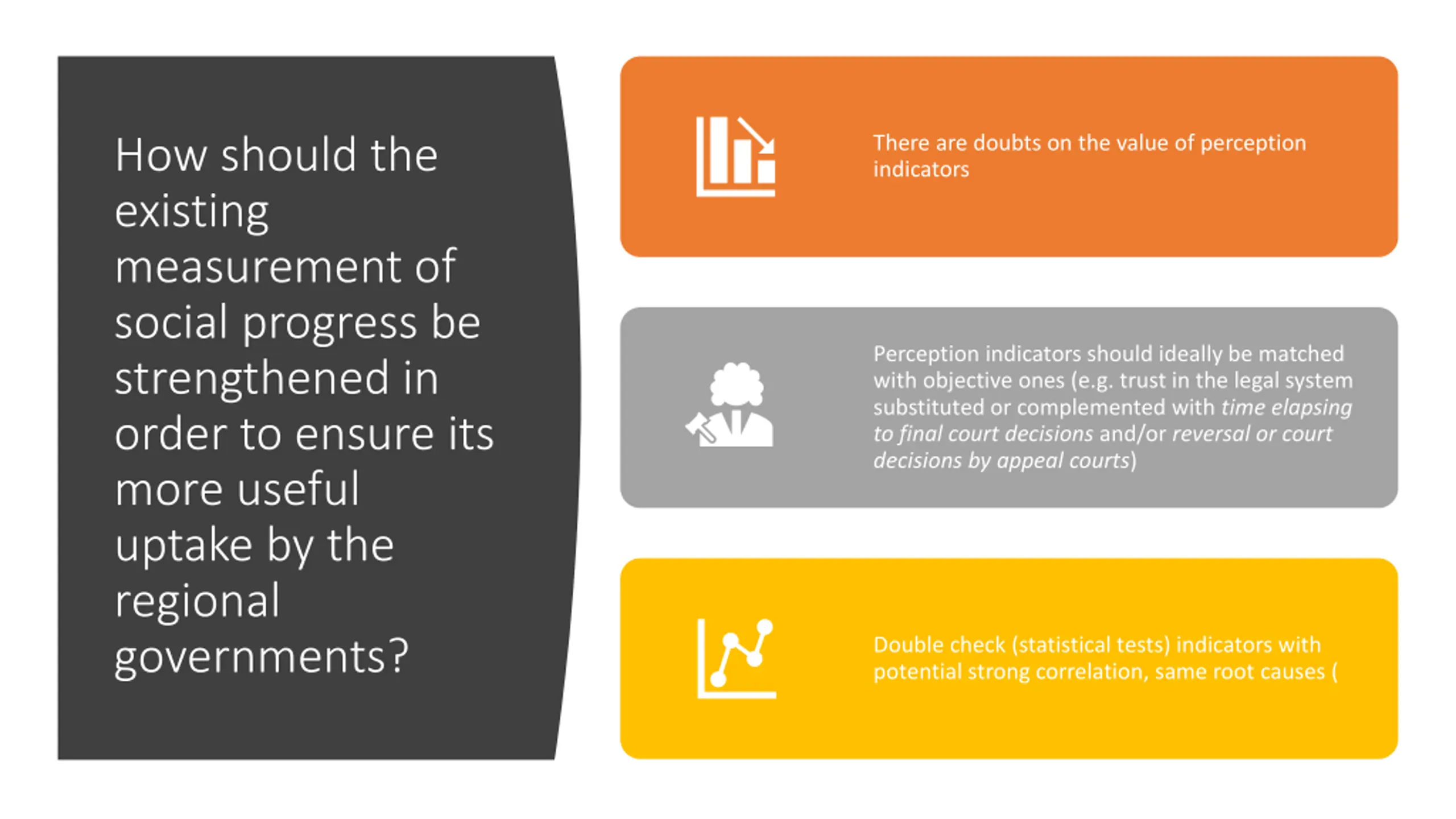 There are doubts on the value of perception indicators How should the existing measurement of social progress be strengthened in order to ensure its more useful uptake by the regional governments? Perception indicators should ideally be matched with objective ones (e.g. trust in the legal system substituted or complemented with time elapsing to final court decisions and/or reversal or court decisions by appeal courts) Double check (statistical tests) indicators with potential strong correlation, same root causes (