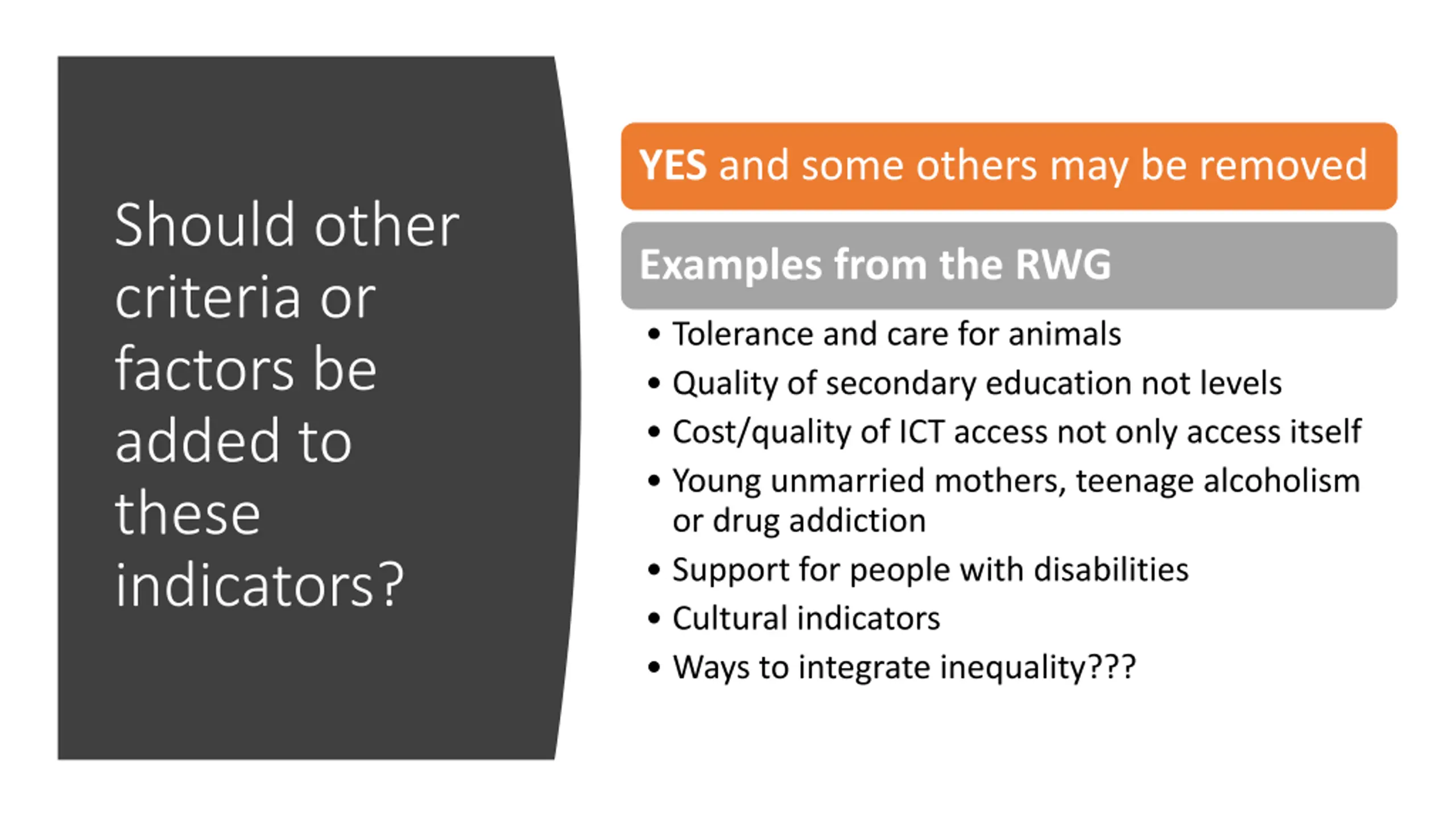 YES and some others may be removed Should other criteria or factors be added to these indicators? Examples from the RWG Tolerance and care for animals Quality of secondary education not levels Cost/quality of ICT access not only access itself Young unmarried mothers, teenage alcoholism or drug addiction Support for people with disabilities Cultural indicators Ways to integrate inequality???