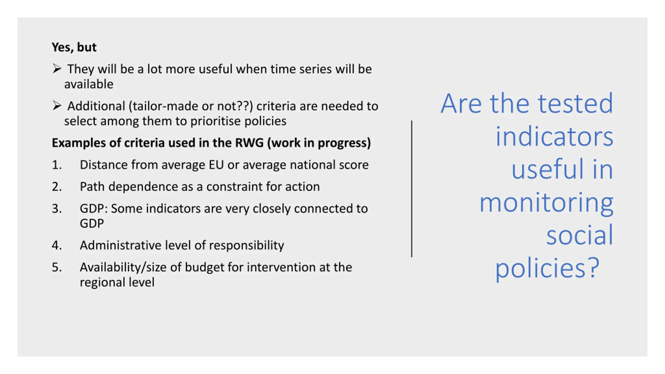 Yes, but They will be a lot more useful when time series will be available Additional (tailor-made or not??) criteria are needed to select among them to prioritise policies Are the tested indicators useful in monitoring Examples of criteria used in the RWG (work in progress) 1. Distance from average EU or average national score 2. Path dependence as a constraint for action 3. GDP: Some indicators are very closely connected to GDP social 4. Administrative level of responsibility policies? 5. Availability/size of budget for intervention at the regional level
