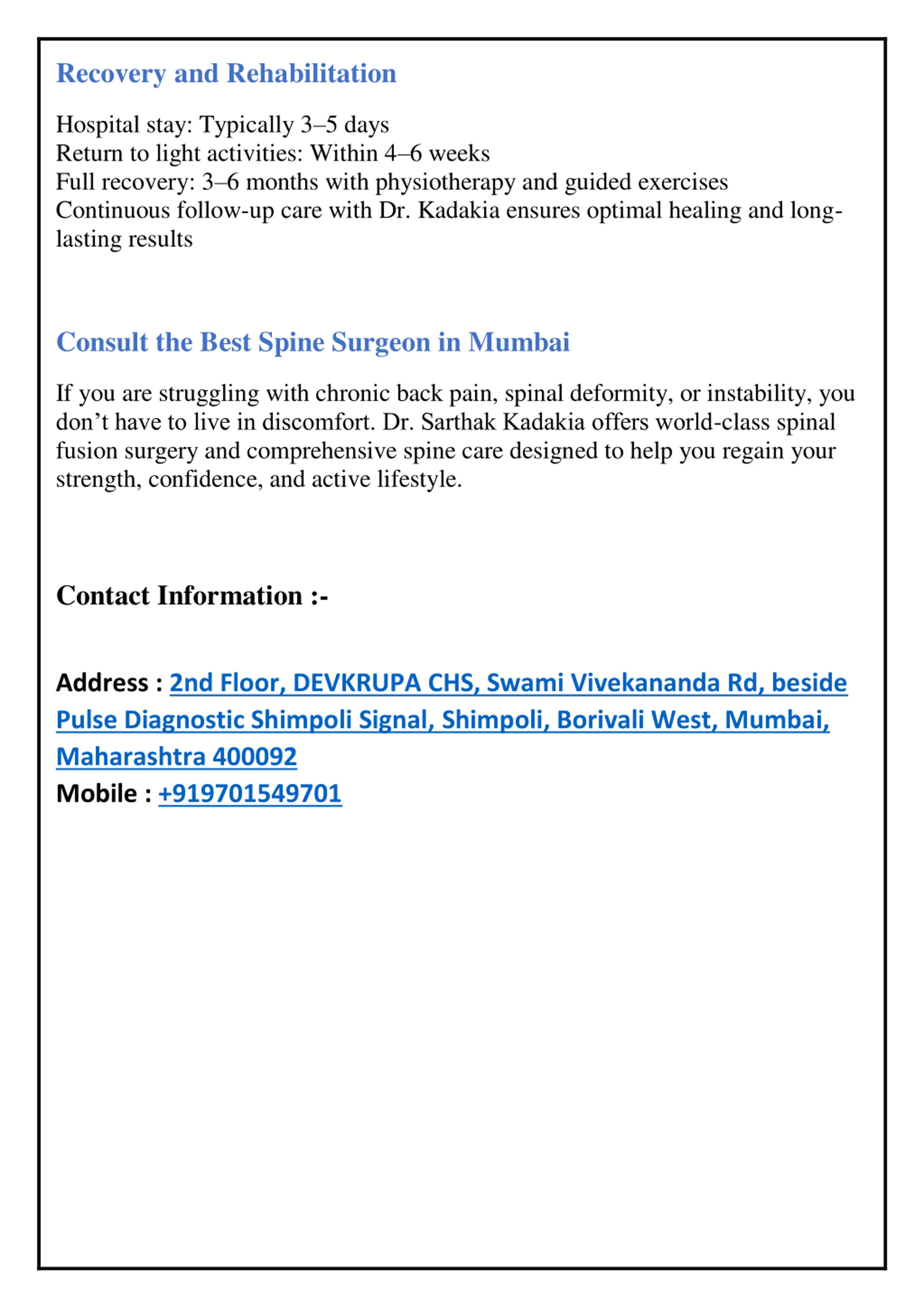 Recovery and Rehabilitation Hospital stay: Typically 3 5 days Return to light activities: Within 4 6 weeks Full recovery: 3 6 months with physiotherapy and guided exercises Continuous follow-up care with Dr. Kadakia ensures optimal healing and long- lasting results Consult the Best Spine Surgeon in Mumbai If you are struggling with chronic back pain, spinal deformity, or instability, you don t have to live in discomfort. Dr. Sarthak Kadakia offers world-class spinal fusion surgery and comprehensive spine care designed to help you regain your strength, confidence, and active lifestyle. Contact Information :- Address : 2nd Floor, DEVKRUPA CHS, Swami Vivekananda Rd, beside Pulse Diagnostic Shimpoli Signal, Shimpoli, Borivali West, Mumbai, Maharashtra 400092 Mobile : +919701549701