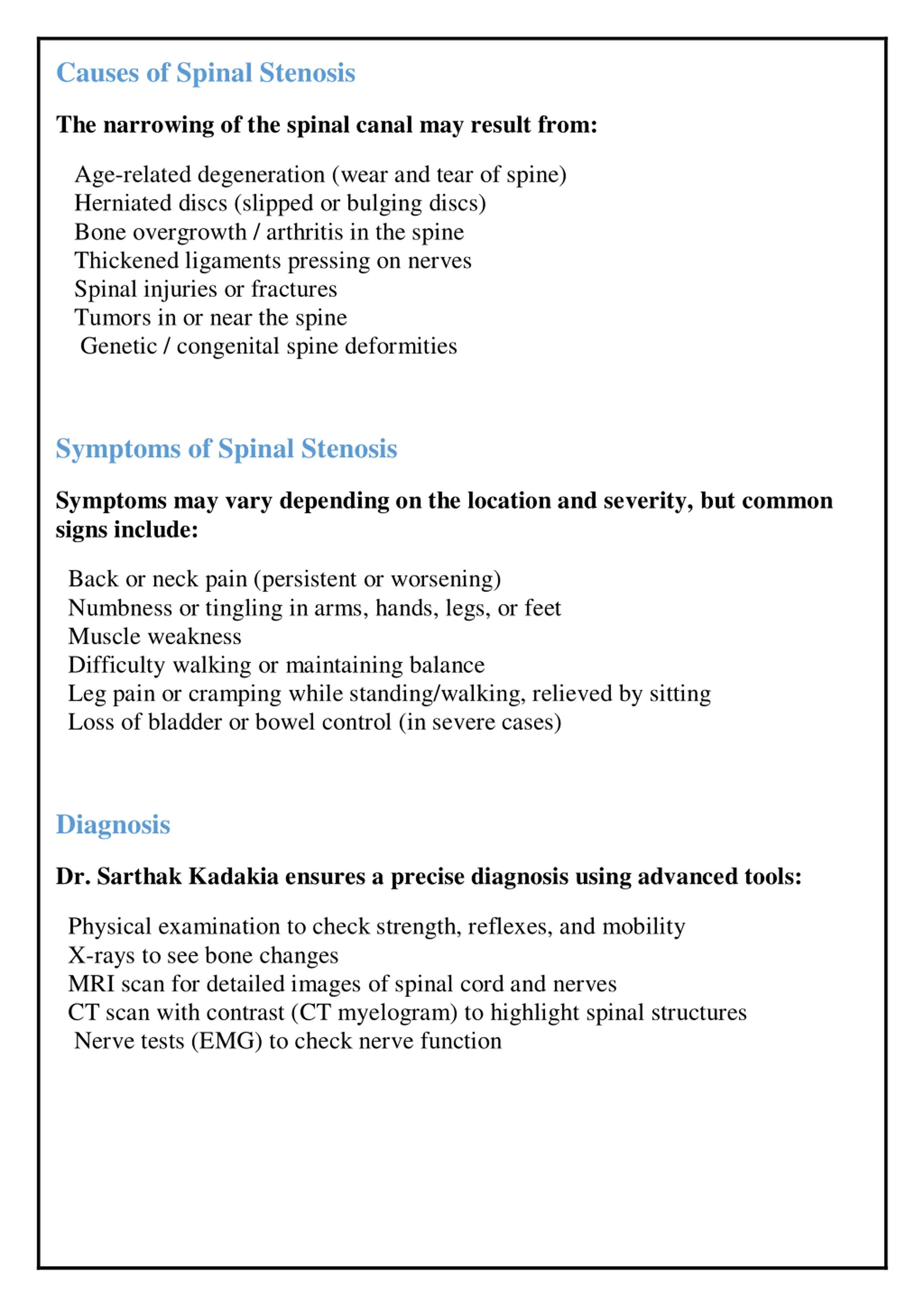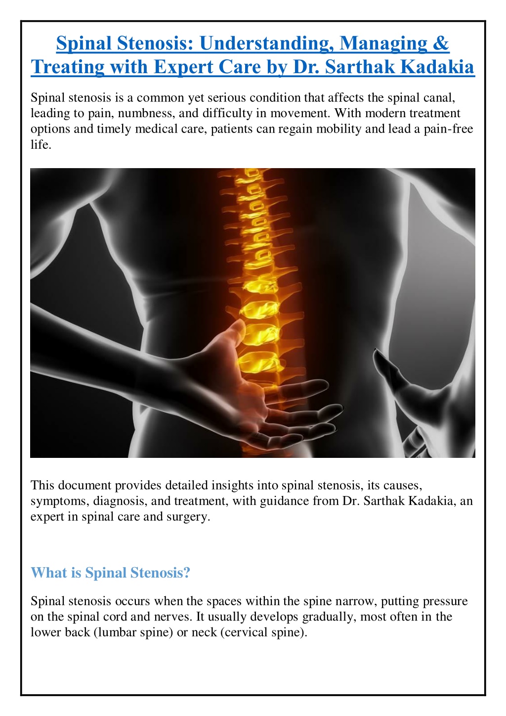 Spinal Stenosis: Understanding, Managing & Treating with Expert Care by Dr. Sarthak Kadakia Spinal stenosis is a common yet serious condition that affects the spinal canal, leading to pain, numbness, and difficulty in movement. With modern treatment options and timely medical care, patients can regain mobility and lead a pain-free life. This document provides detailed insights into spinal stenosis, its causes, symptoms, diagnosis, and treatment, with guidance from Dr. Sarthak Kadakia, an expert in spinal care and surgery. What is Spinal Stenosis? Spinal stenosis occurs when the spaces within the spine narrow, putting pressure on the spinal cord and nerves. It usually develops gradually, most often in the lower back (lumbar spine) or neck (cervical spine).