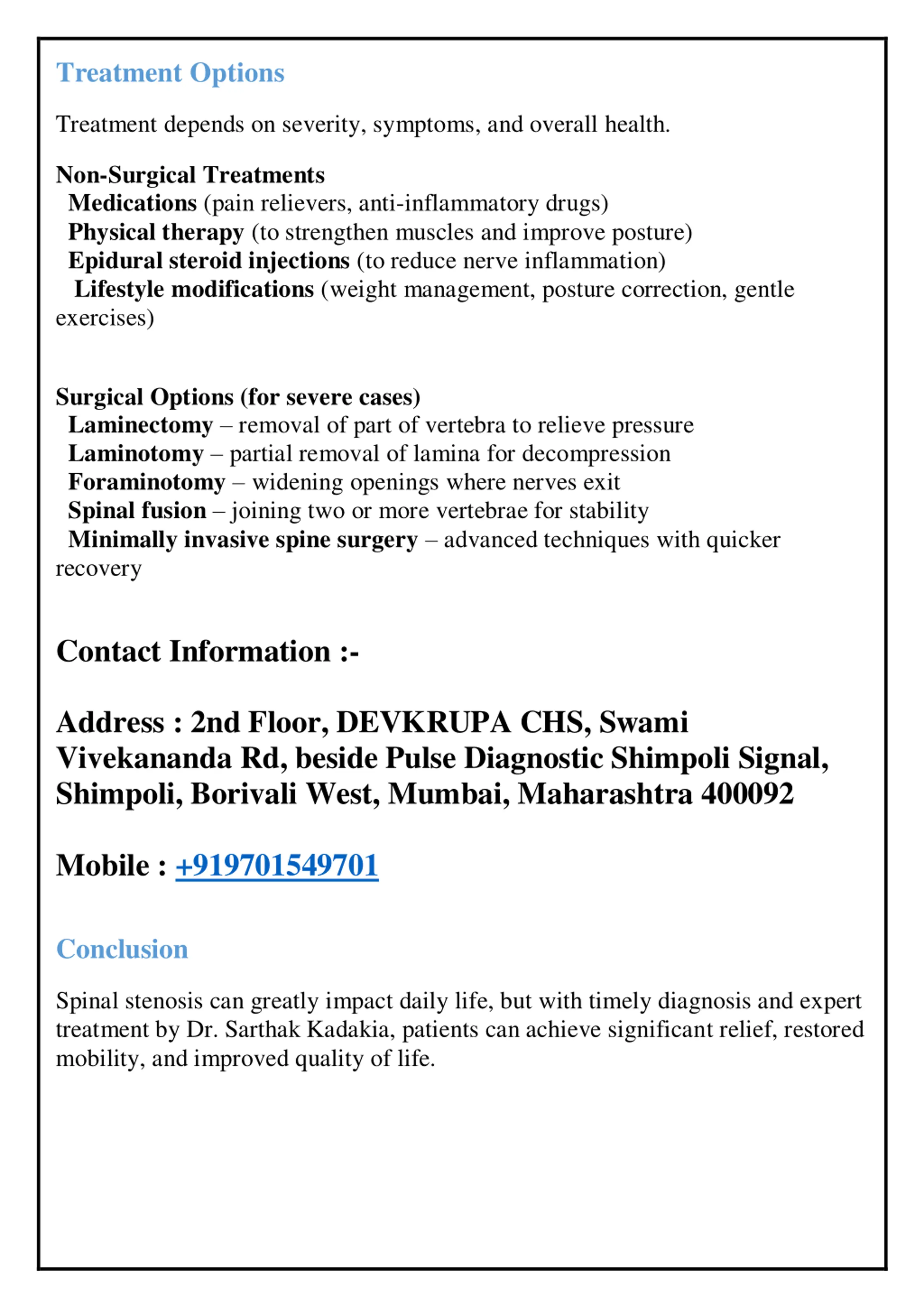 Treatment Options Treatment depends on severity, symptoms, and overall health. Non-Surgical Treatments Medications (pain relievers, anti-inflammatory drugs) Physical therapy (to strengthen muscles and improve posture) Epidural steroid injections (to reduce nerve inflammation) Lifestyle modifications (weight management, posture correction, gentle exercises) Surgical Options (for severe cases) Laminectomy removal of part of vertebra to relieve pressure Laminotomy partial removal of lamina for decompression Foraminotomy widening openings where nerves exit Spinal fusion joining two or more vertebrae for stability Minimally invasive spine surgery advanced techniques with quicker recovery Contact Information :- Address : 2nd Floor, DEVKRUPA CHS, Swami Vivekananda Rd, beside Pulse Diagnostic Shimpoli Signal, Shimpoli, Borivali West, Mumbai, Maharashtra 400092 Mobile : +919701549701 Conclusion Spinal stenosis can greatly impact daily life, but with timely diagnosis and expert treatment by Dr. Sarthak Kadakia, patients can achieve significant relief, restored mobility, and improved quality of life.