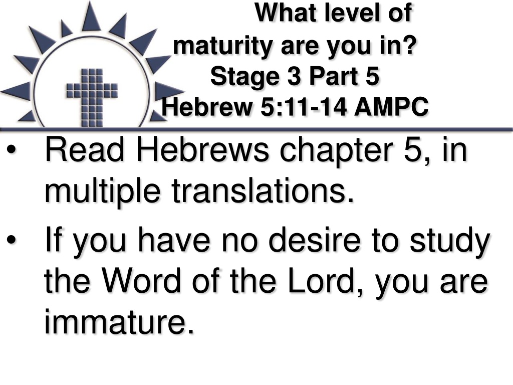 What level of maturity are you in? Stage 3 Part 5 Hebrew 5:11-14 AMPC Read Hebrews chapter 5, in multiple translations. If you have no desire to study the Word of the Lord, you are immature.
