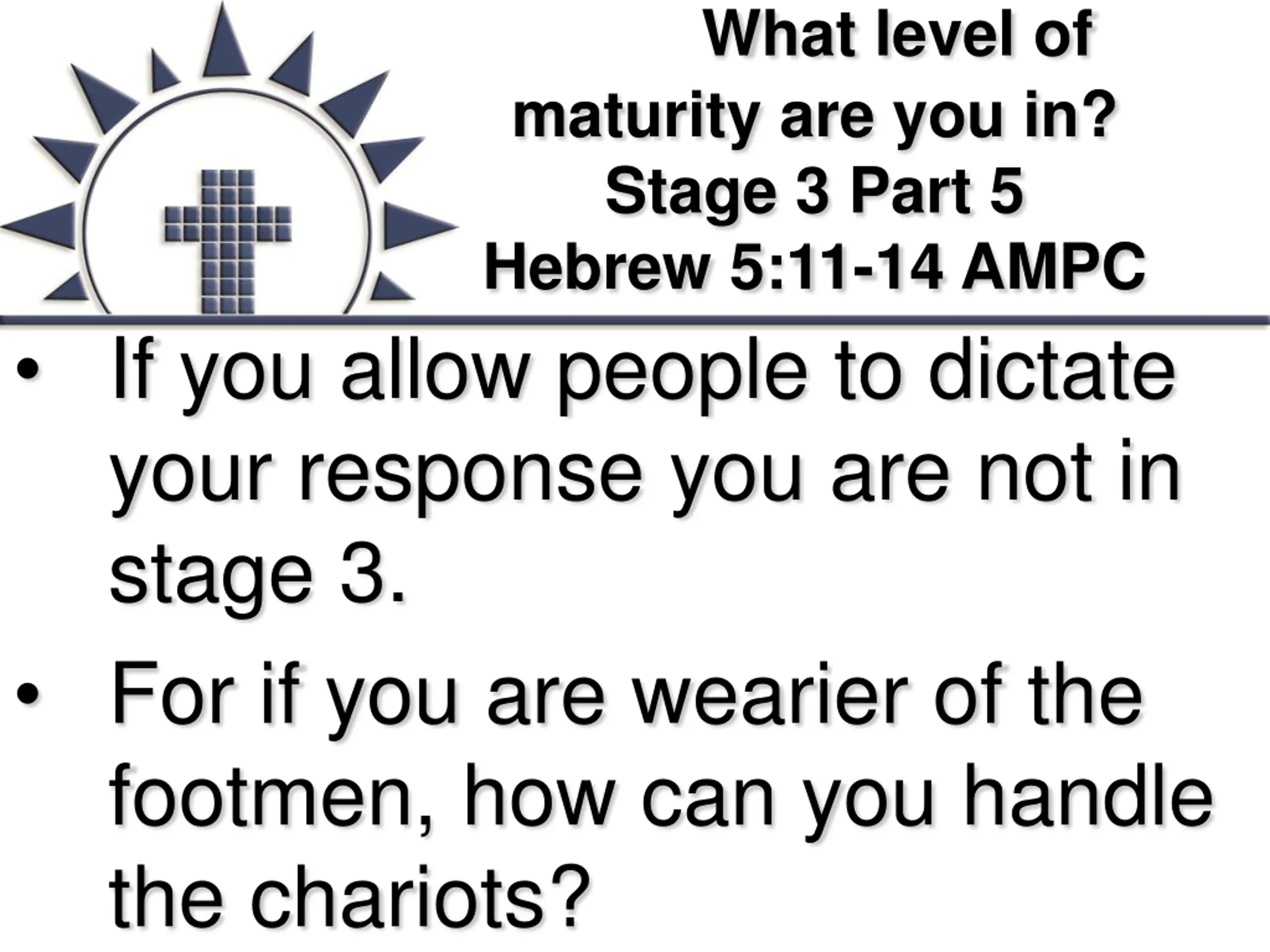What level of maturity are you in? Stage 3 Part 5 Hebrew 5:11-14 AMPC If you allow people to dictate your response you are not in stage 3. For if you are wearier of the footmen, how can you handle