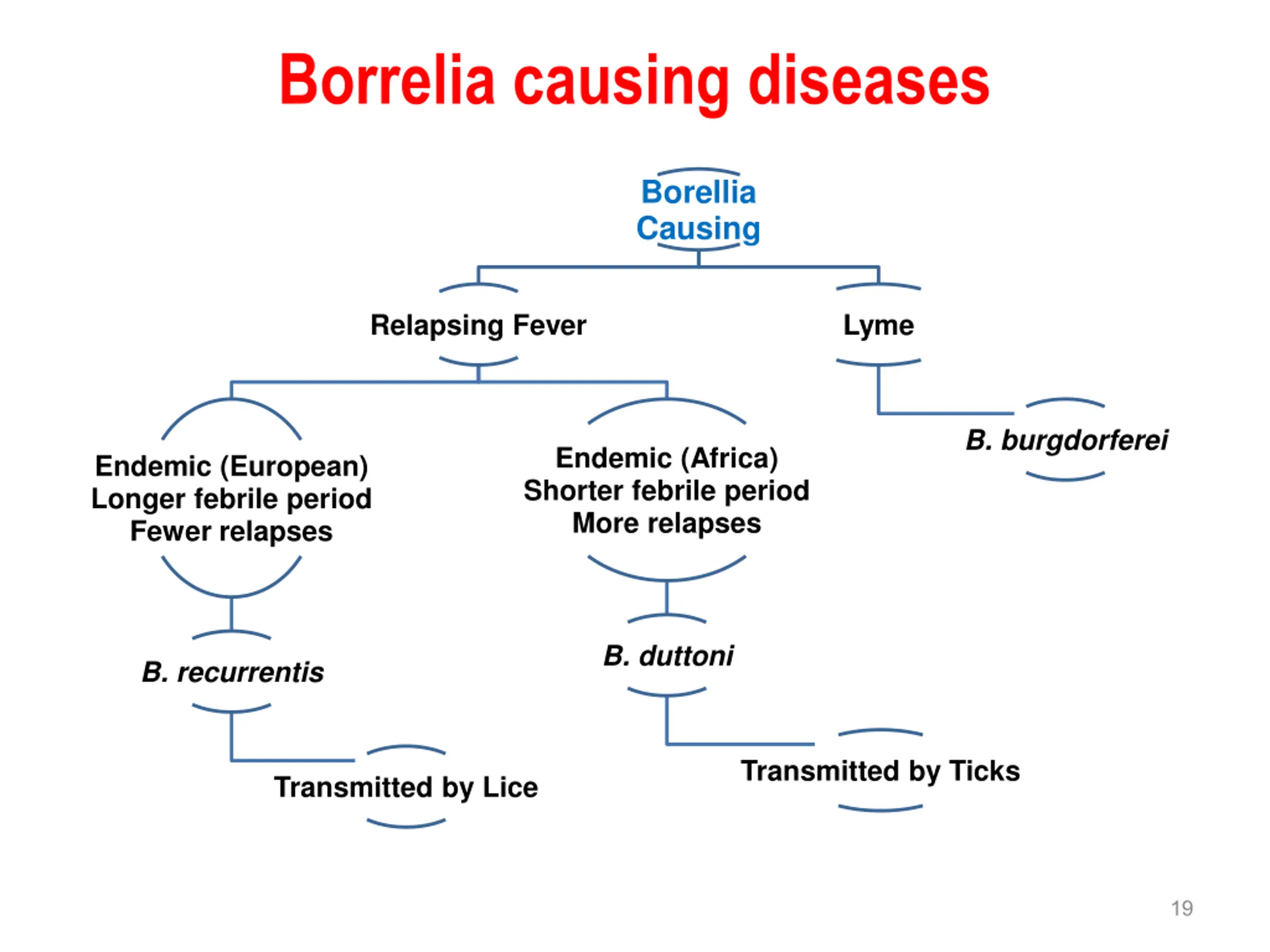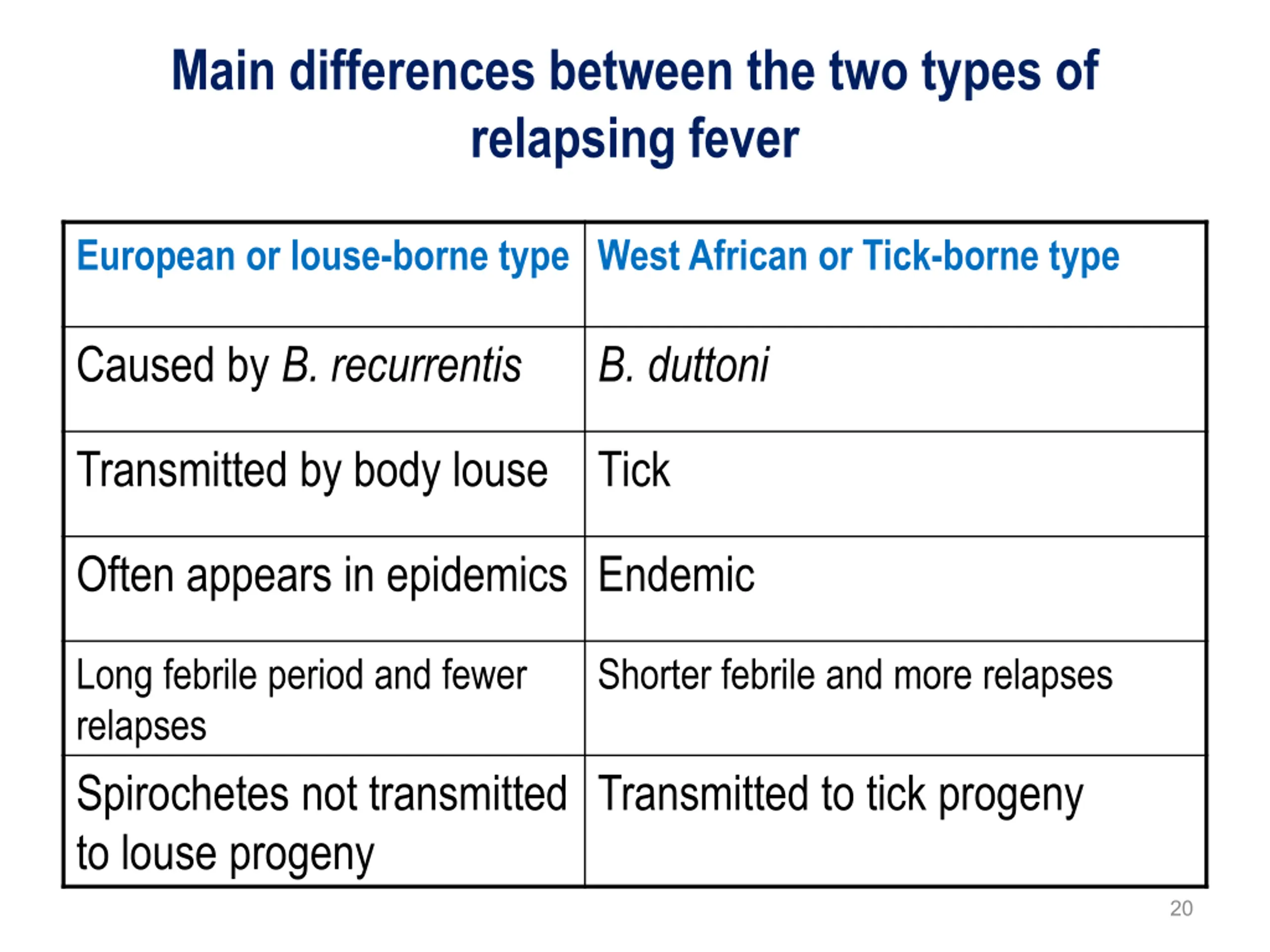 Main differences between the two types of relapsing fever European or louse-borne type West African or Tick-borne type Caused by B. recurrentis B. duttoni Transmitted by body louse Tick Often appears in epidemics Endemic Long febrile period and fewer relapses Spirochetes not transmitted to louse progeny Shorter febrile and more relapses Transmitted to tick progeny 20