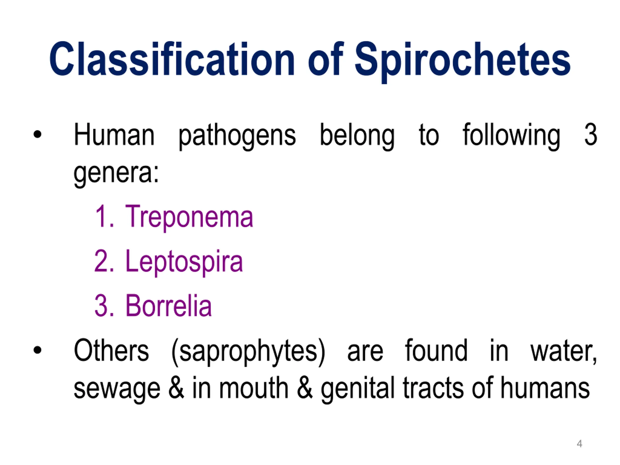 Classification of Spirochetes Human pathogens belong to following 3 genera: 1. Treponema 2. Leptospira 3. Borrelia Others (saprophytes) are found in water, sewage & in mouth & genital tracts of humans 4