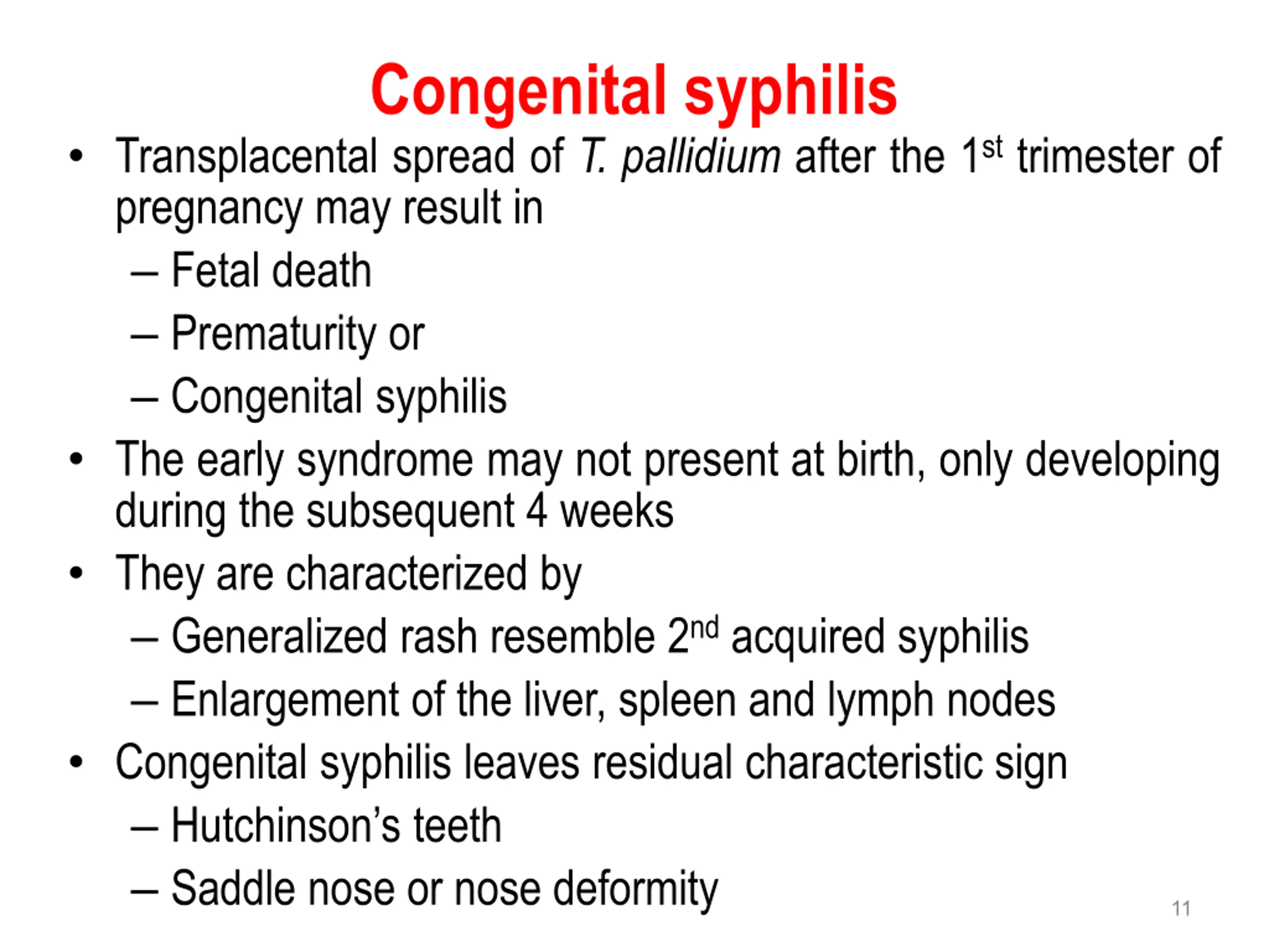 Congenital syphilis Transplacental spread of T. pallidium after the 1st trimester of pregnancy may result in Fetal death Prematurity or Congenital syphilis The early syndrome may not present at birth, only developing during the subsequent 4 weeks They are characterized by Generalized rash resemble 2nd acquired syphilis Enlargement of the liver, spleen and lymph nodes Congenital syphilis leaves residual characteristic sign Hutchinson s teeth Saddle nose or nose deformity 11
