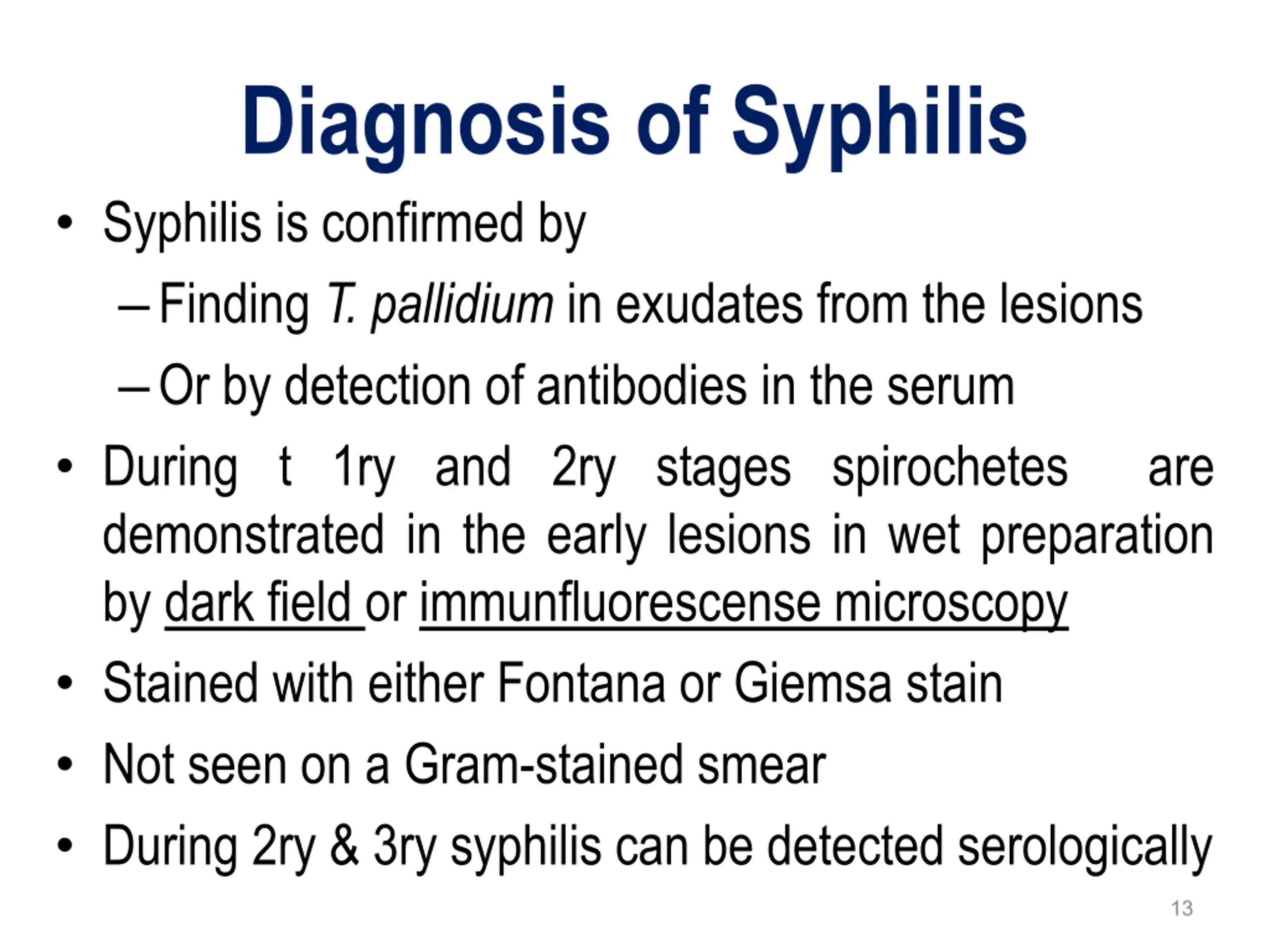 Diagnosis of Syphilis Syphilis is confirmed by Finding T. pallidium in exudates from the lesions Or by detection of antibodies in the serum During t 1ry and 2ry stages spirochetes are demonstrated in the early lesions in wet preparation by dark field or immunfluorescense microscopy Stained with either Fontana or Giemsa stain Not seen on a Gram-stained smear During 2ry & 3ry syphilis can be detected serologically 13