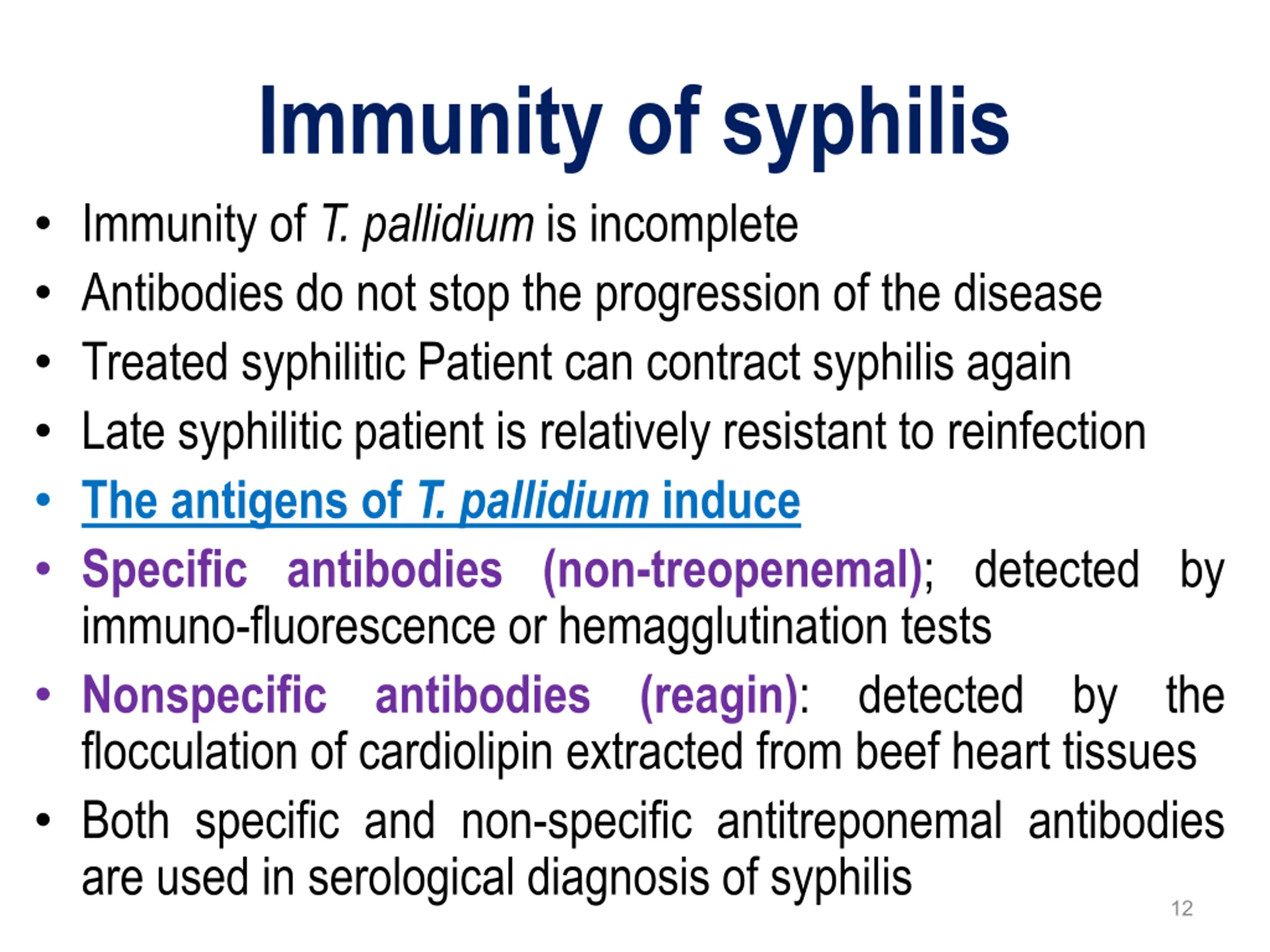 Immunity of syphilis Immunity of T. pallidium is incomplete Antibodies do not stop the progression of the disease Treated syphilitic Patient can contract syphilis again Late syphilitic patient is relatively resistant to reinfection The antigens of T. pallidium induce Specific antibodies (non-treopenemal); detected by immuno-fluorescence or hemagglutination tests Nonspecific antibodies (reagin): detected by the flocculation of cardiolipin extracted from beef heart tissues Both specific and non-specific antitreponemal antibodies are used in serological diagnosis of syphilis 12