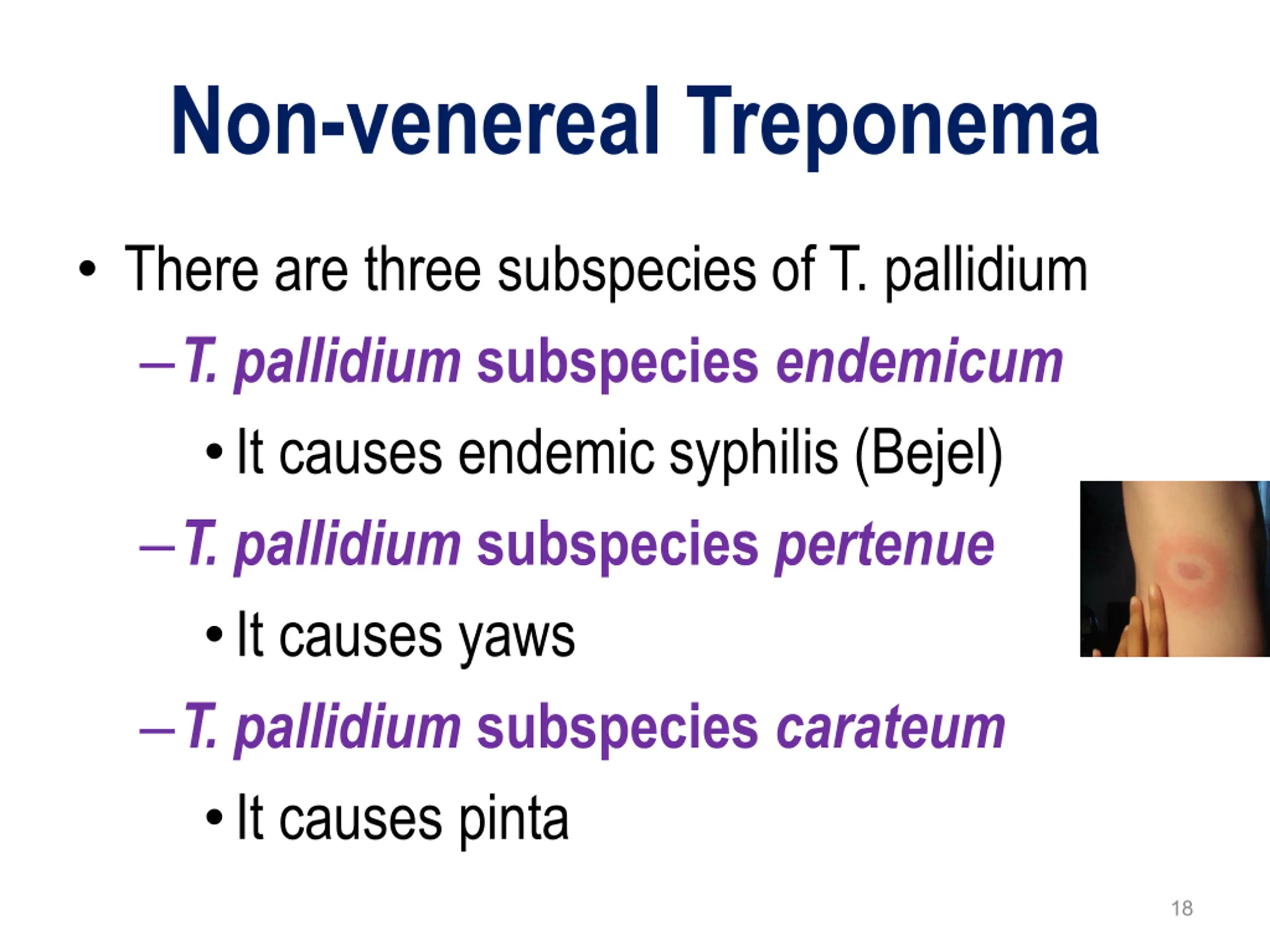 Non-venereal Treponema There are three subspecies of T. pallidium T. pallidium subspecies endemicum It causes endemic syphilis (Bejel) T. pallidium subspecies pertenue It causes yaws T. pallidium subspecies carateum It causes pinta 18