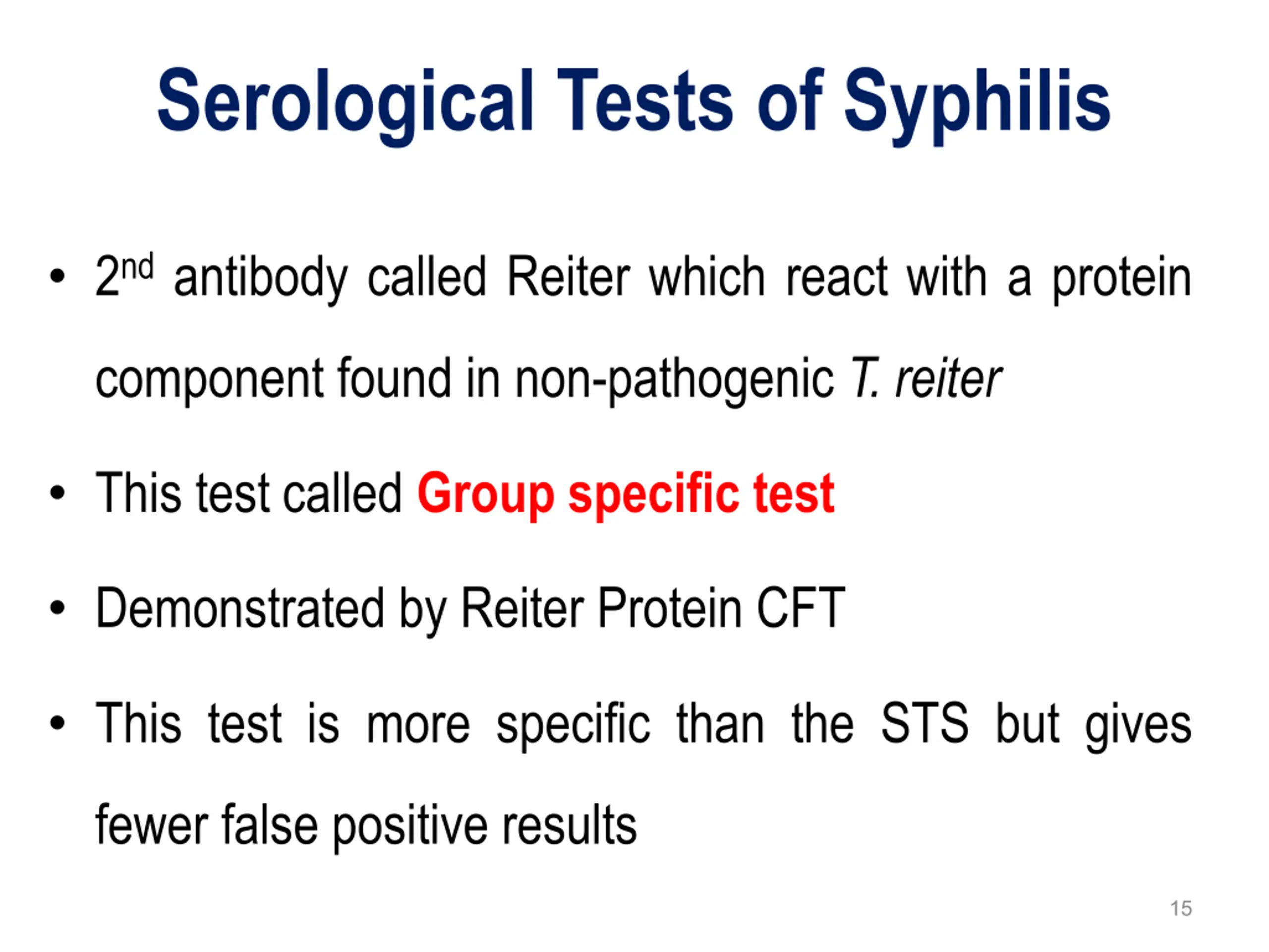 Serological Tests of Syphilis 2nd antibody called Reiter which react with a protein component found in non-pathogenic T.reiter This test called Group specific test Demonstrated by Reiter Protein CFT This test is more specific than the STS but gives fewer false positive results 15