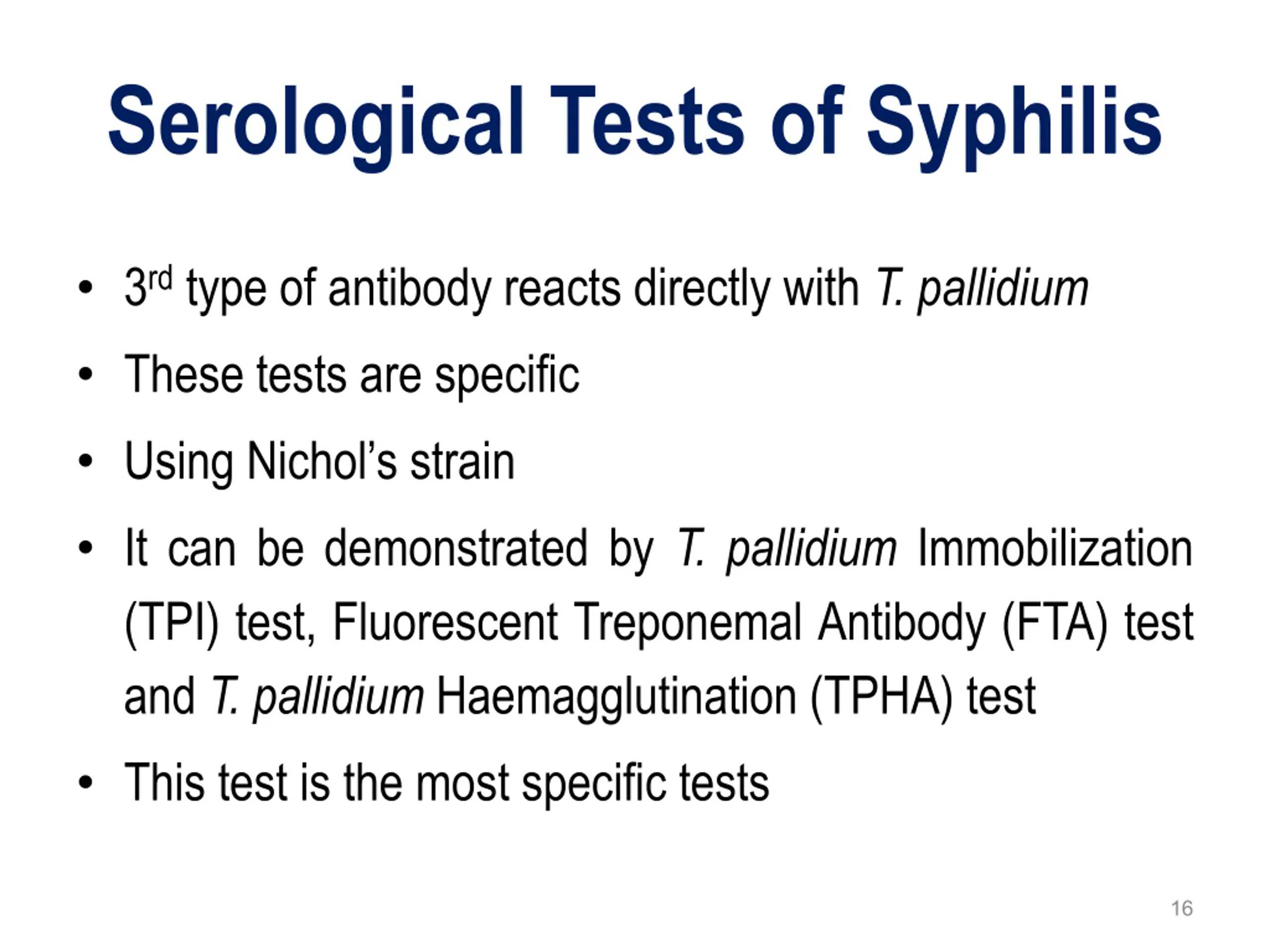 Serological Tests of Syphilis 3rd type of antibody reacts directly with T. pallidium These tests are specific Using Nichol s strain It can be demonstrated by T. pallidium Immobilization (TPI) test, Fluorescent Treponemal Antibody (FTA) test and T. pallidium Haemagglutination (TPHA) test This test is the most specific tests 16