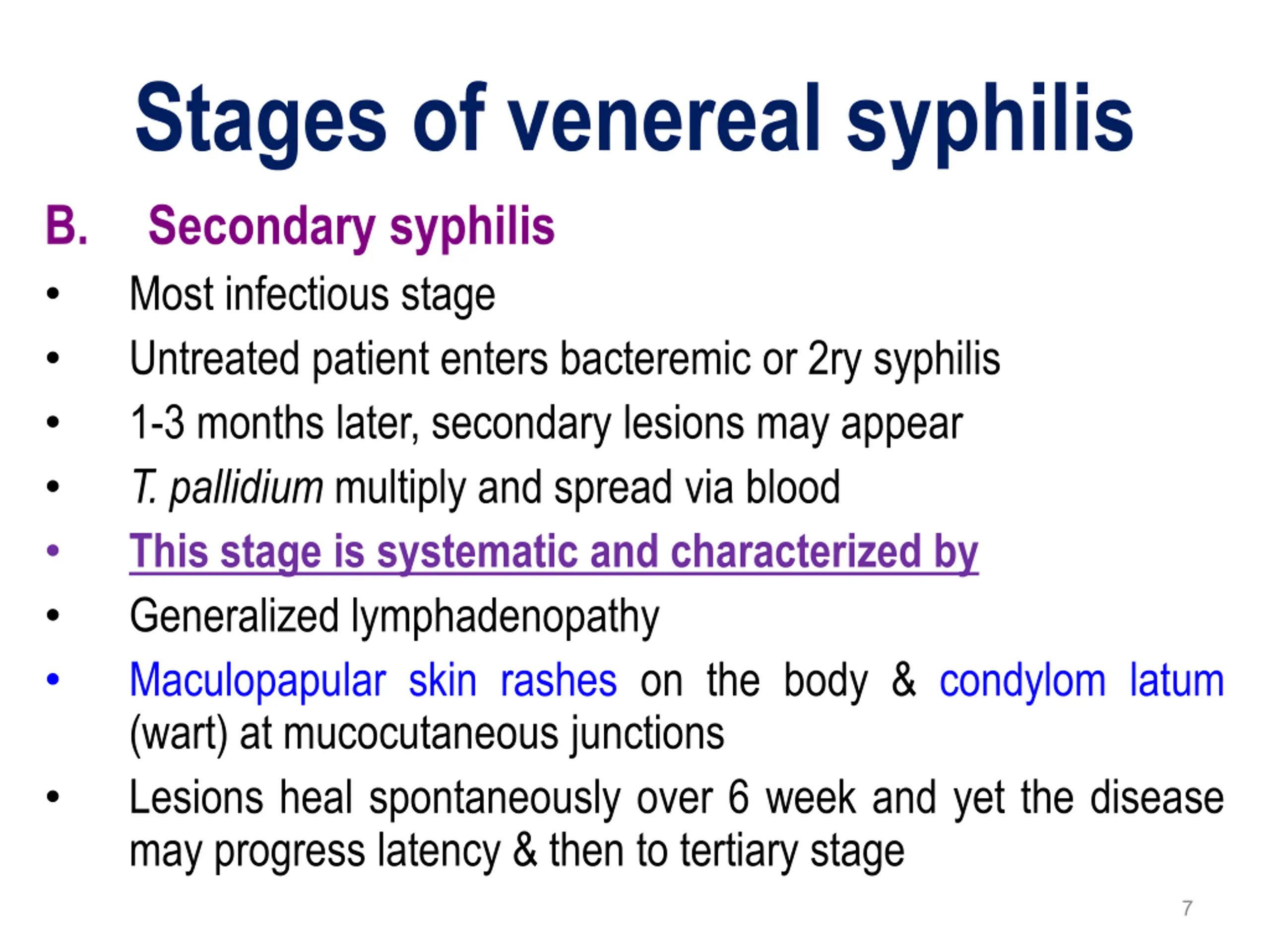 Stages of venereal syphilis Secondary syphilis Most infectious stage Untreated patient enters bacteremic or 2ry syphilis 1-3 months later, secondary lesions may appear T. pallidium multiply and spread via blood This stage is systematic and characterized by Generalized lymphadenopathy Maculopapular skin rashes on the body & condylom latum (wart) at mucocutaneous junctions Lesions heal spontaneously over 6 week and yet the disease may progress latency & then to tertiary stage B. 7