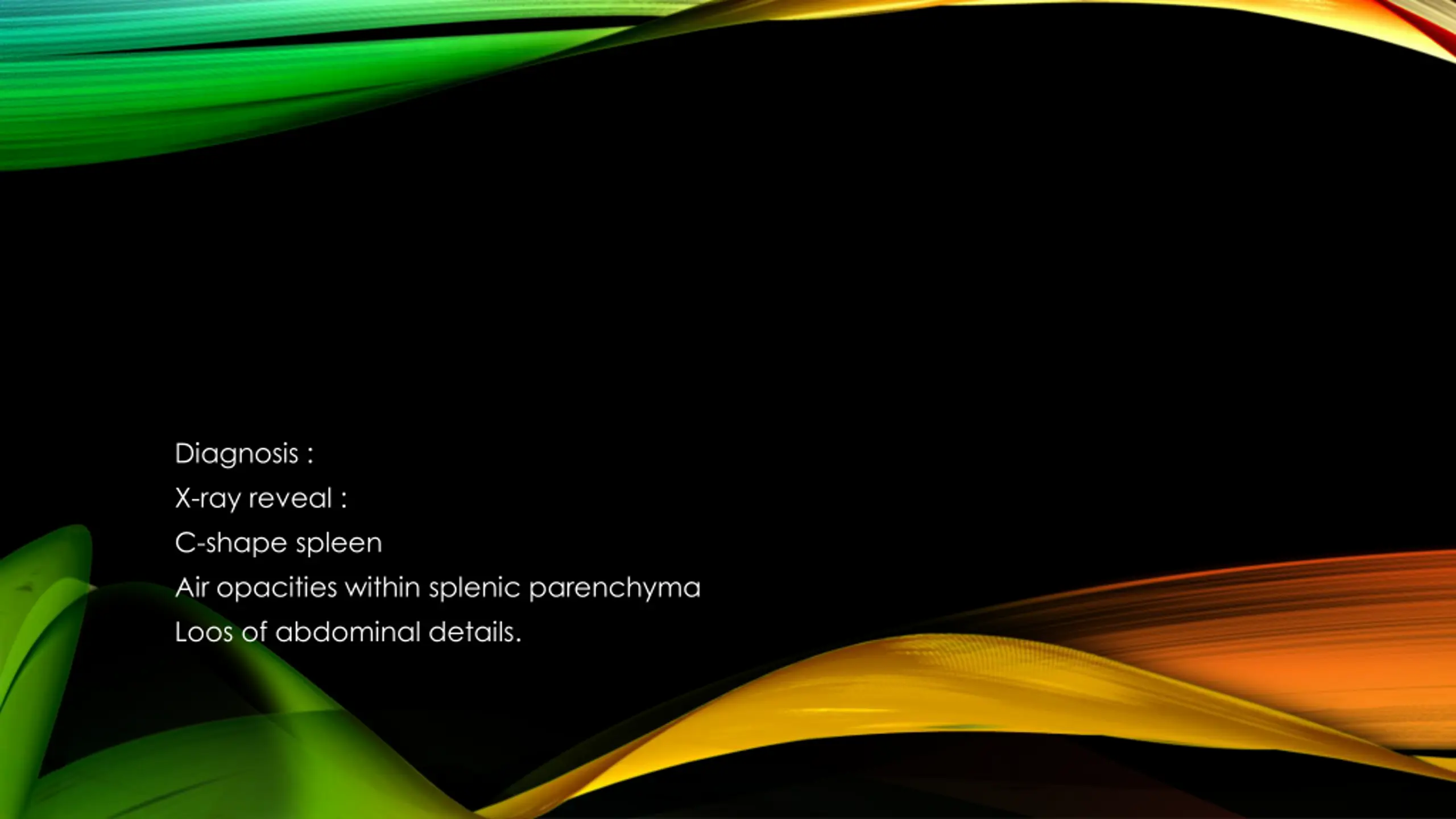 Diagnosis : X-ray reveal : C-shape spleen Air opacities within splenic parenchyma Loos of abdominal details.
