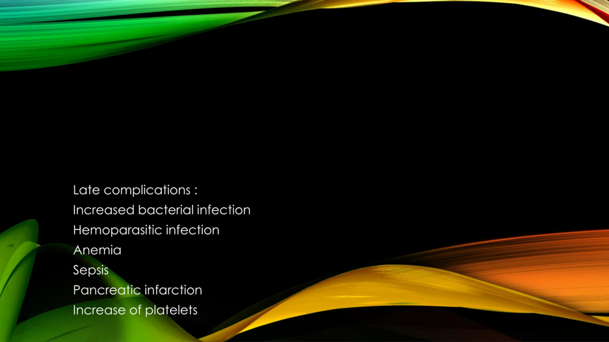 Late complications : Increased bacterial infection Hemoparasitic infection Anemia Sepsis Pancreatic infarction Increase of platelets