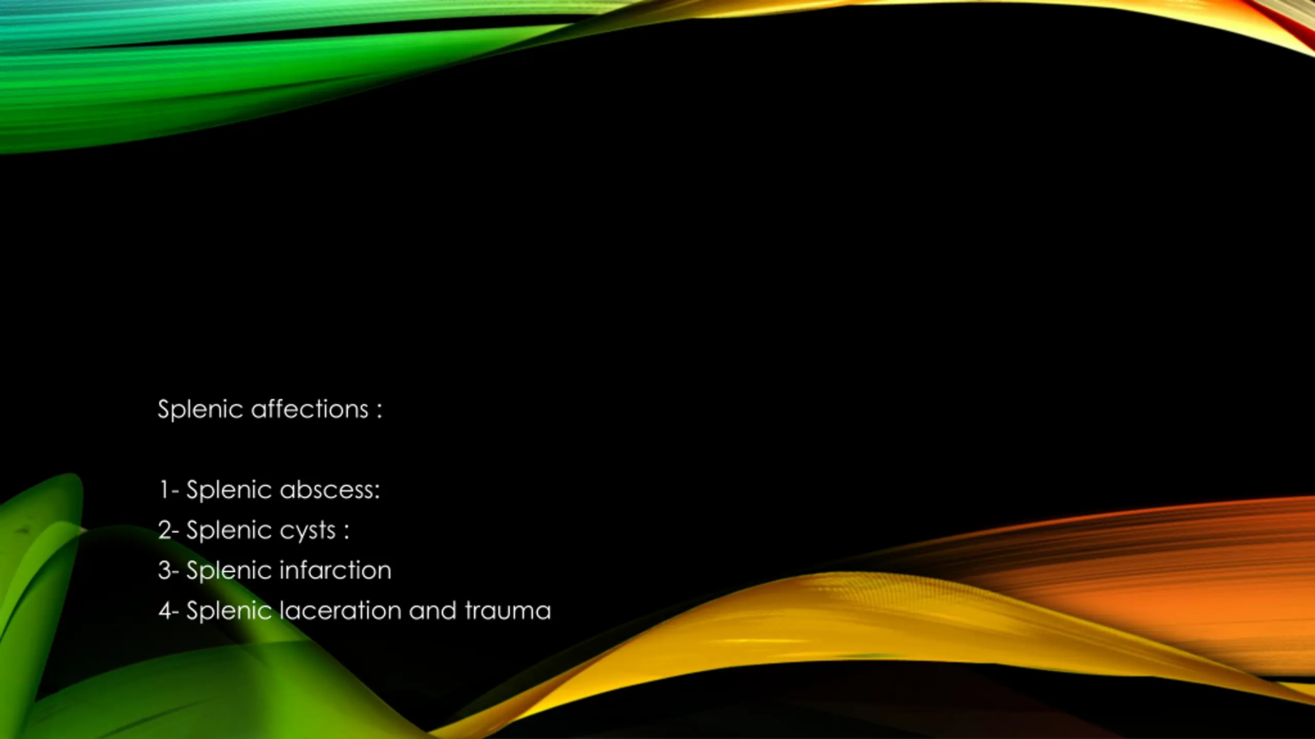 Splenic affections : 1- Splenic abscess: 2- Splenic cysts : 3- Splenic infarction 4- Splenic laceration and trauma