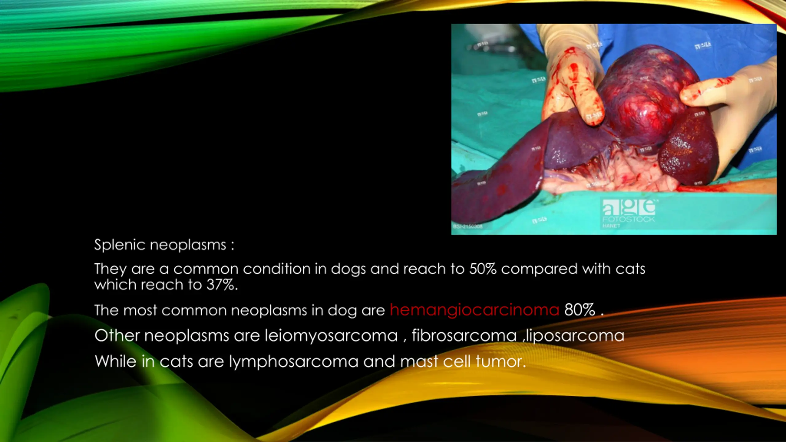 Splenic neoplasms : They are a common condition in dogs and reach to 50% compared with cats which reach to 37%. The most common neoplasms in dog are hemangiocarcinoma 80% . Other neoplasms are leiomyosarcoma , fibrosarcoma ,liposarcoma While in cats are lymphosarcoma and mast cell tumor.