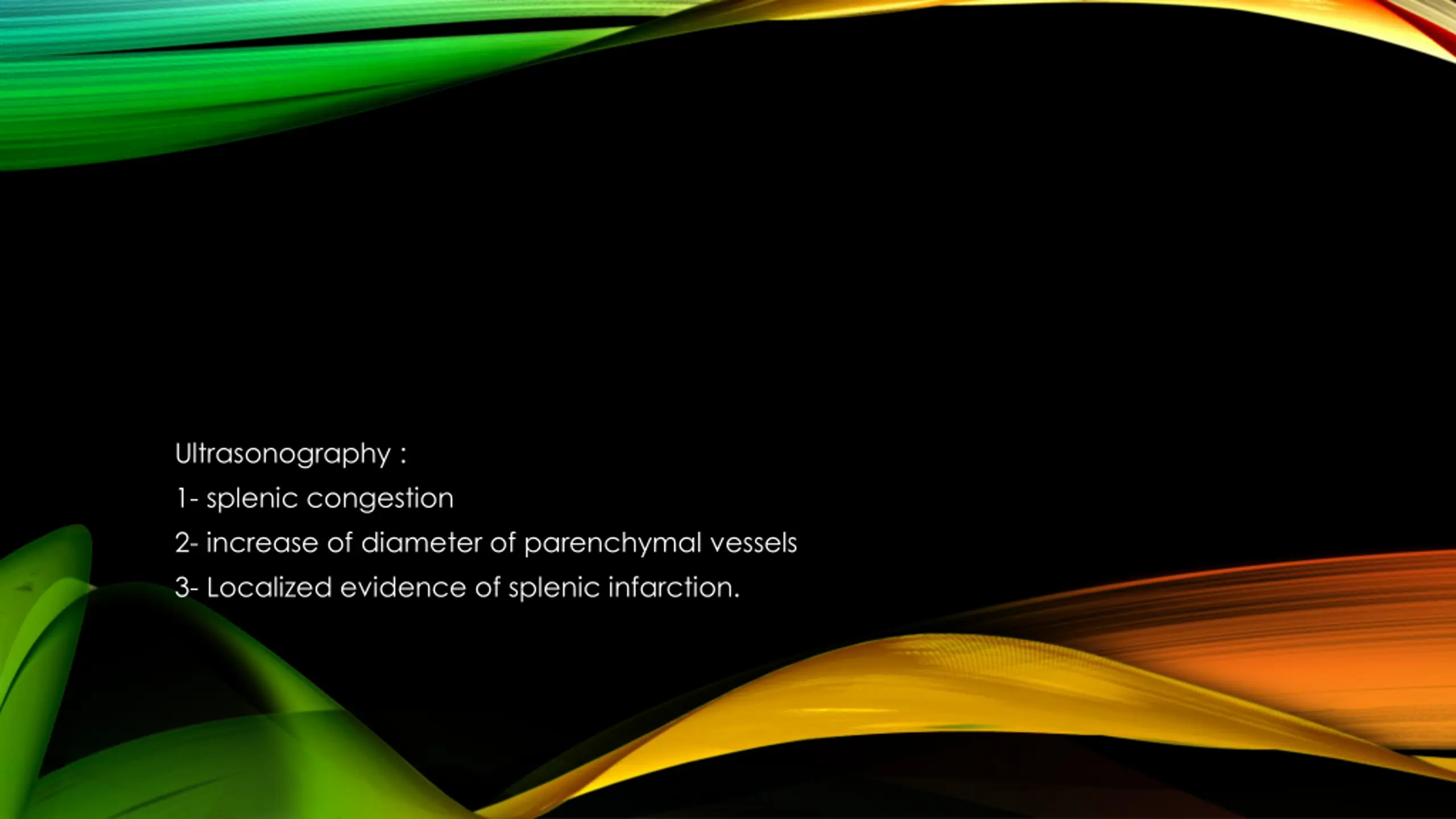 Ultrasonography : 1- splenic congestion 2- increase of diameter of parenchymal vessels 3- Localized evidence of splenic infarction.
