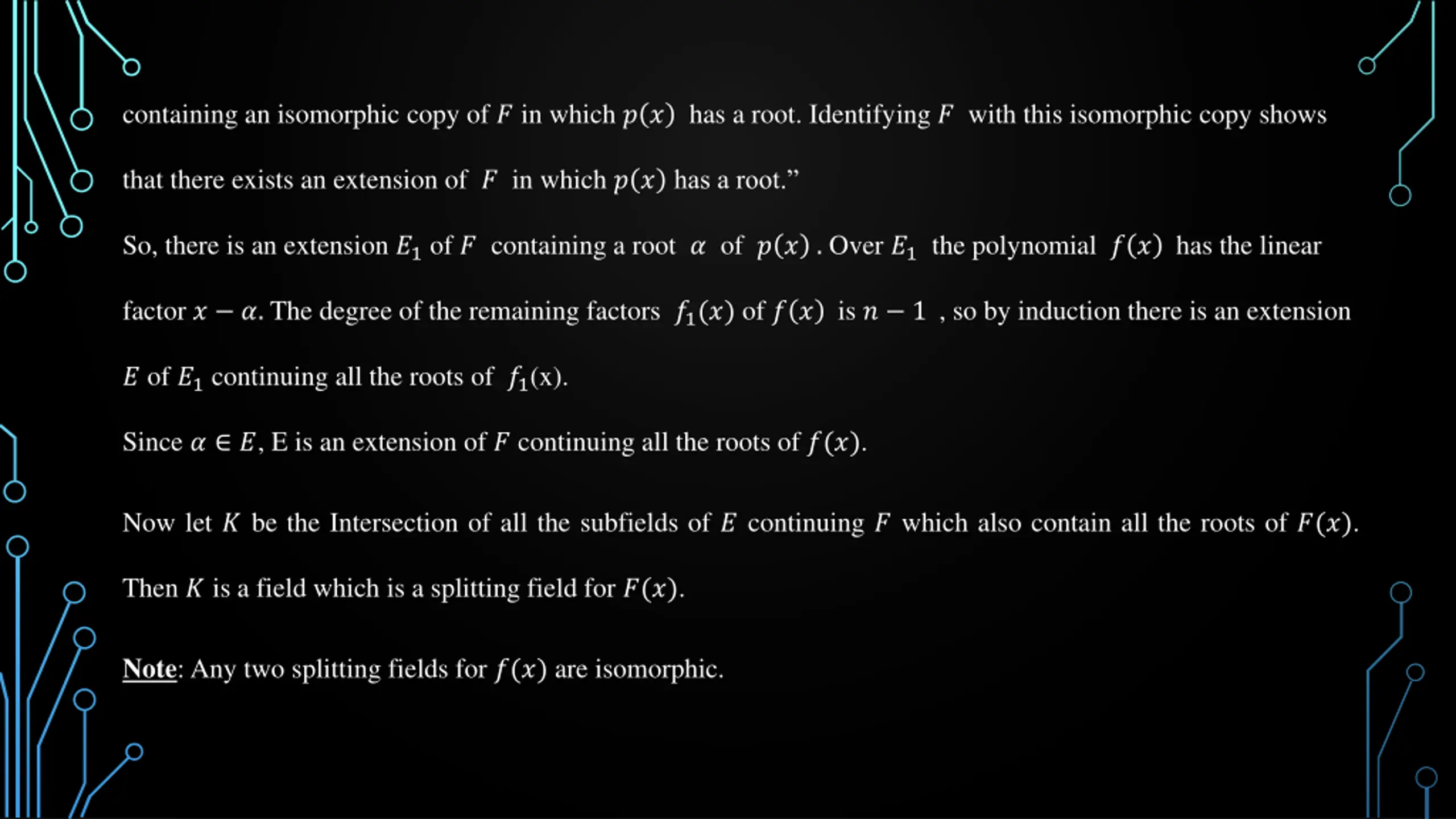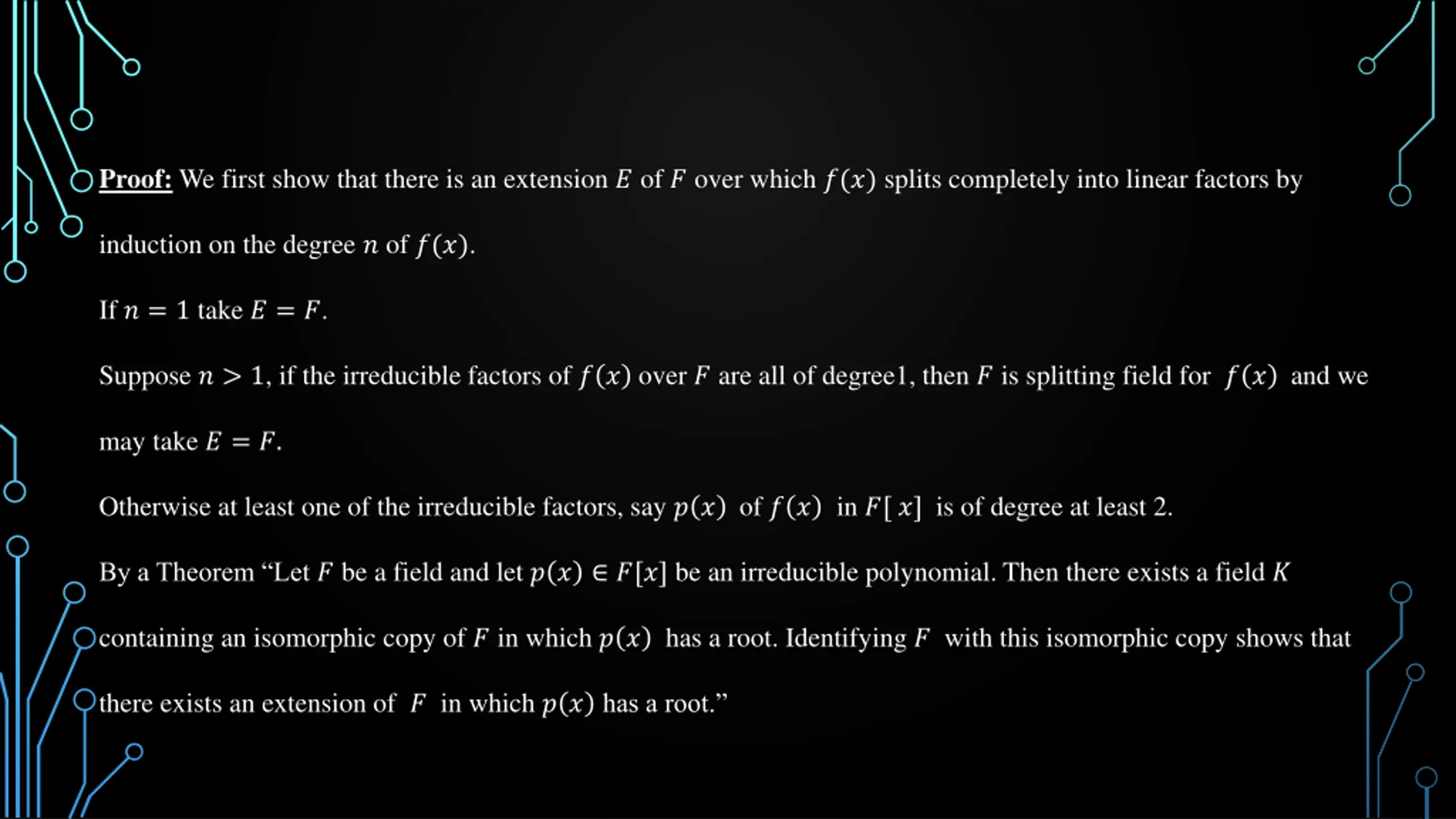 Proof: We first show that there is an extension ? of ? over which ?(?) splits completely into linear factors by induction on the degree ? of ?(?). If ? = 1 take ? = ?. Suppose ? > 1, if the irreducible factors of ? ? over ? are all of degree1, then ? is splitting field for ? ? and we may take ? = ?. Otherwise at least one of the irreducible factors, say ? ? of ? ? in ?[ ?] is of degree at least 2. By a Theorem Let ? be a field and let ? ? ?[?] be an irreducible polynomial. Then there exists a field ? containing an isomorphic copy of ? in which ? ? has a root. Identifying ? with this isomorphic copy shows that there exists an extension of ? in which ? ?has a root.