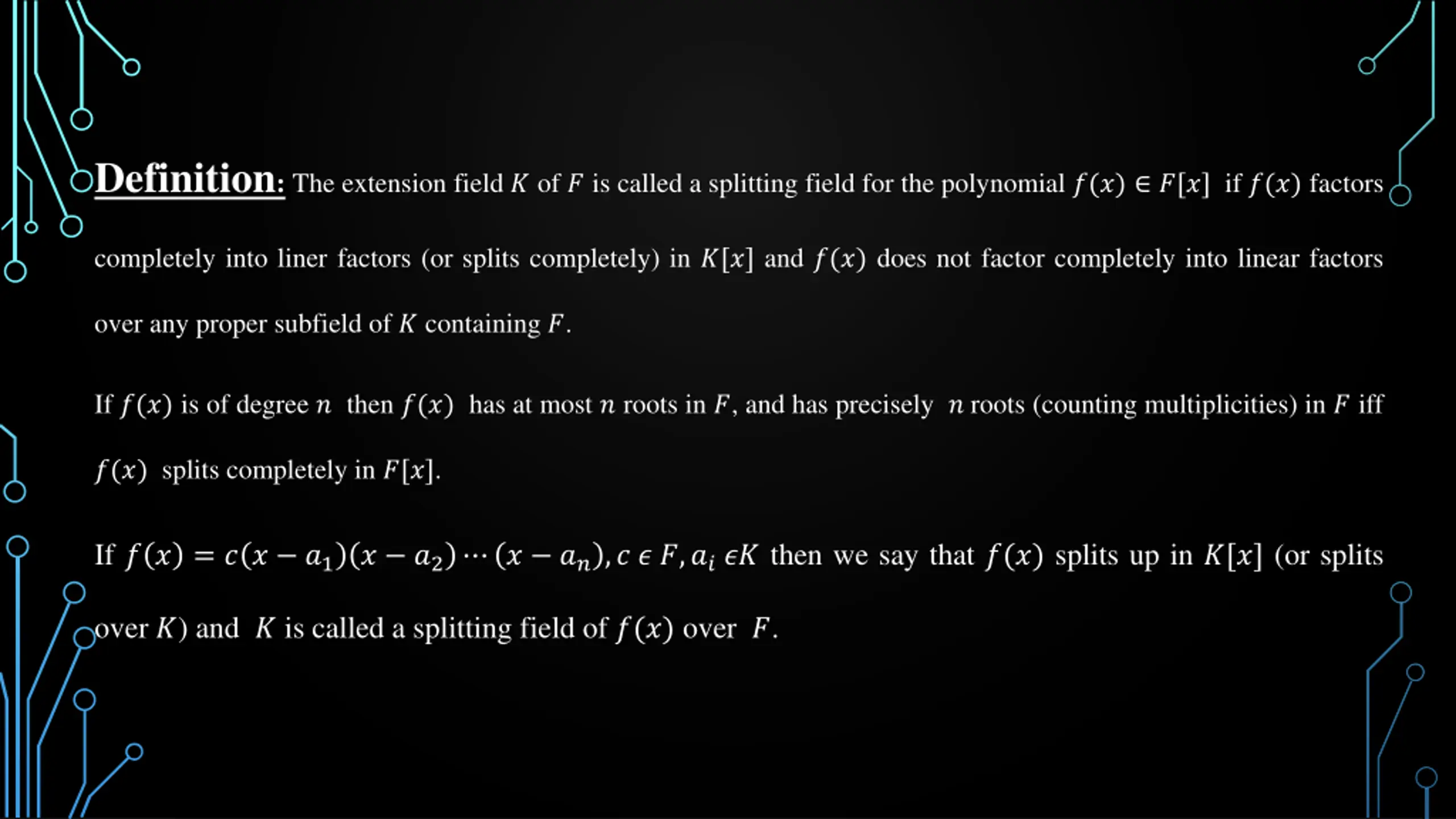 Definition: The extension field ? of ? is called a splitting field for the polynomial ?(?) ?[?] if ?(?) factors completely into liner factors (or splits completely) in ?[?] and ?(?) does not factor completely into linear factors over any proper subfield of ? containing ?. If ?(?) is of degree ? then ?(?) has at most ? roots in ?, and has precisely ? roots (counting multiplicities) in ? iff ?(?) splits completely in ?[?]. If ? ? = ? ? ?1 ? ?2 ? ??,? ? ?,?? ?? then we say that ?(?) splits up in ?[?] (or splits over ?) and ? is called a splitting field of ?(?) over ?.