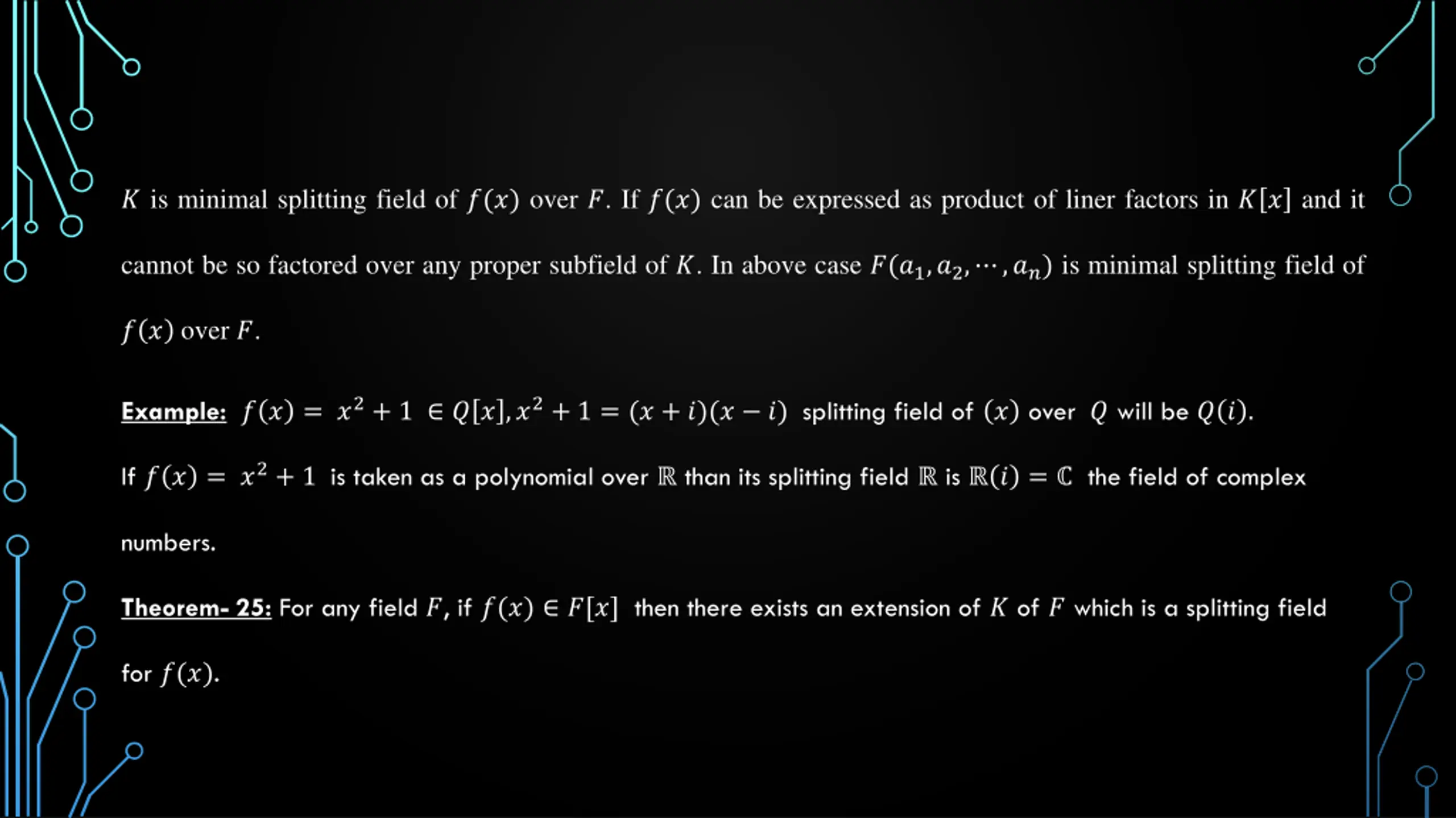 ? is minimal splitting field of ?(?) over ?. If ?(?) can be expressed as product of liner factors in ? ? and it cannot be so factored over any proper subfield of ?. In above case ?(?1,?2, ,??) is minimal splitting field of ? ? over ?. Example:? ? = ?2+ 1 ? ? ,?2+ 1 = (? + ?)(? ?) splitting field of ? over ? will be ? ? . If ? ? = ?2+ 1 is taken as a polynomial over than its splitting field is ? = the field of complex numbers. Theorem- 25: For any field ?, if ?(?) ?[?] then there exists an extension of ? of ? which is a splitting field for ?(?).