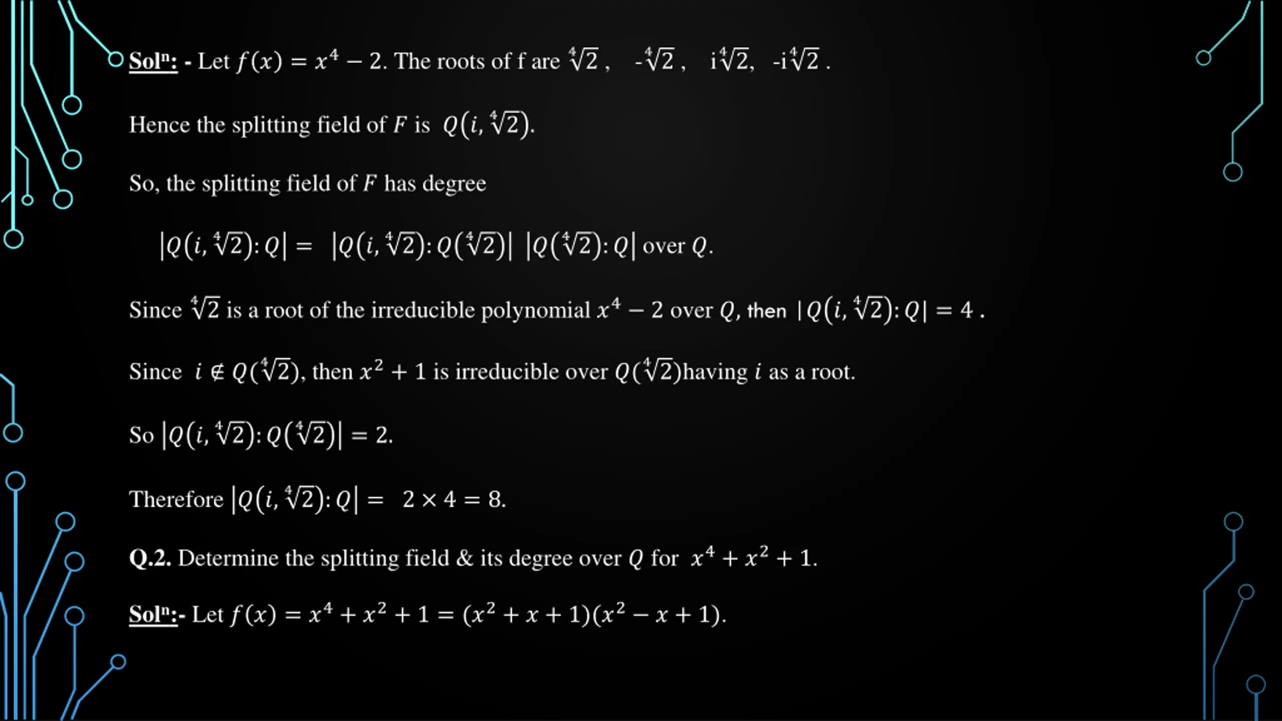 42 , - 42 , i 42, -i 42 . Soln: - Let ? ? = ?4 2. The roots of f are 42 . Hence the splitting field of ? is ? ?, So, the splitting field of ? has degree 42 :? = ? ?, 42 :? 42 ? 42 :?over ?. ? ?, 42 is a root of the irreducible polynomial ?4 2 over ?,then |? ?, 42 :?| = 4 . Since 42), then ?2+ 1 is irreducible over ?( 42)having ? as a root. Since ? ?( 42 :? 42 So ? ?, = 2. 42 :? = 2 4 = 8. Therefore ? ?, Q.2. Determine the splitting field & its degree over ? for ?4+ ?2+ 1. Soln:- Let ? ? = ?4+ ?2+ 1 = (?2+ ? + 1)(?2 ? + 1).