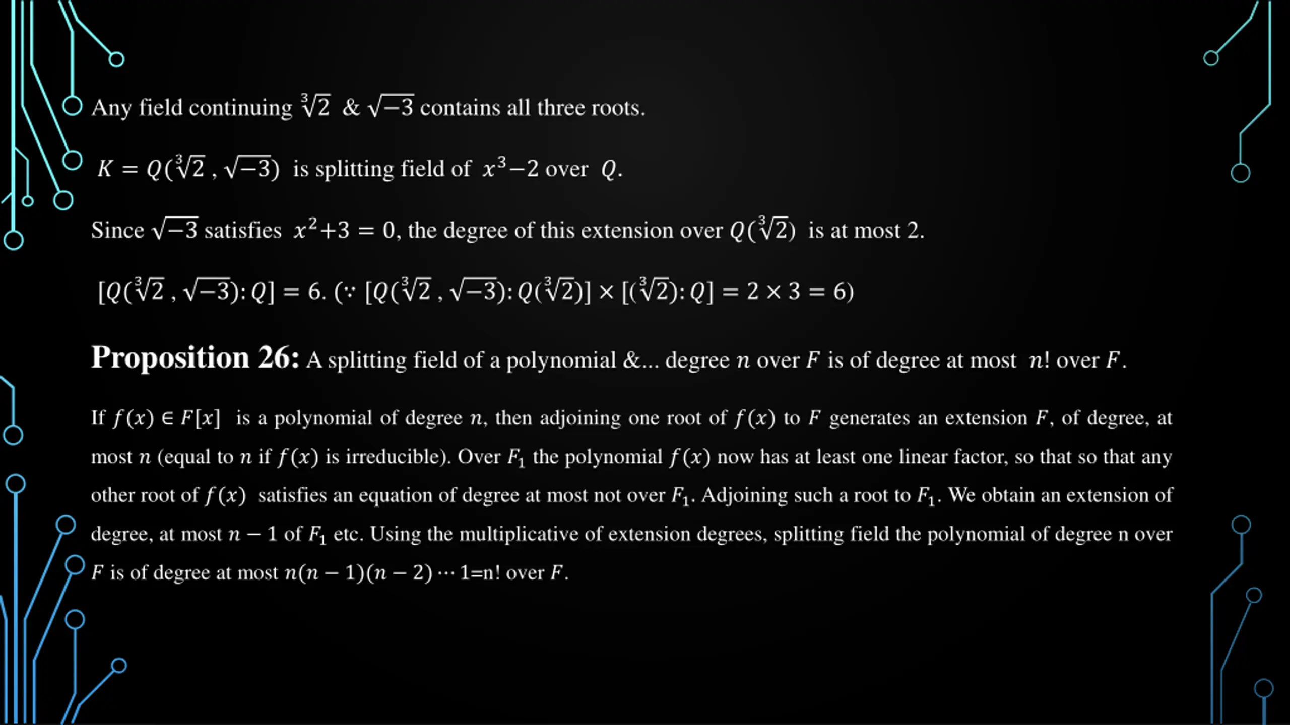 32 & Any field continuing 3 contains all three roots. 32 , 3) is splitting field of ?3 2 over ?. ? = ?( 32) is at most 2. 3 satisfies ?2+3 = 0, the degree of this extension over ?( Since 32 , 32 , 32)] [( 32):?] = 2 3 = 6) [?( 3):?] = 6. ( [?( 3):?( Proposition 26: A splitting field of a polynomial &... degree ? over ? is of degree at most ?! over ?. If ?(?) ?[?] is a polynomial of degree ?, then adjoining one root of ?(?) to ? generates an extension ?, of degree, at most ? (equal to ? if ?(?) is irreducible). Over ?1 the polynomial ?(?) now has at least one linear factor, so that so that any other root of ?(?) satisfies an equation of degree at most not over ?1. Adjoining such a root to ?1. We obtain an extension of degree, at most ? 1 of ?1 etc. Using the multiplicative of extension degrees, splitting field the polynomial of degree n over ? is of degree at most ?(? 1)(? 2) 1=n! over ?.