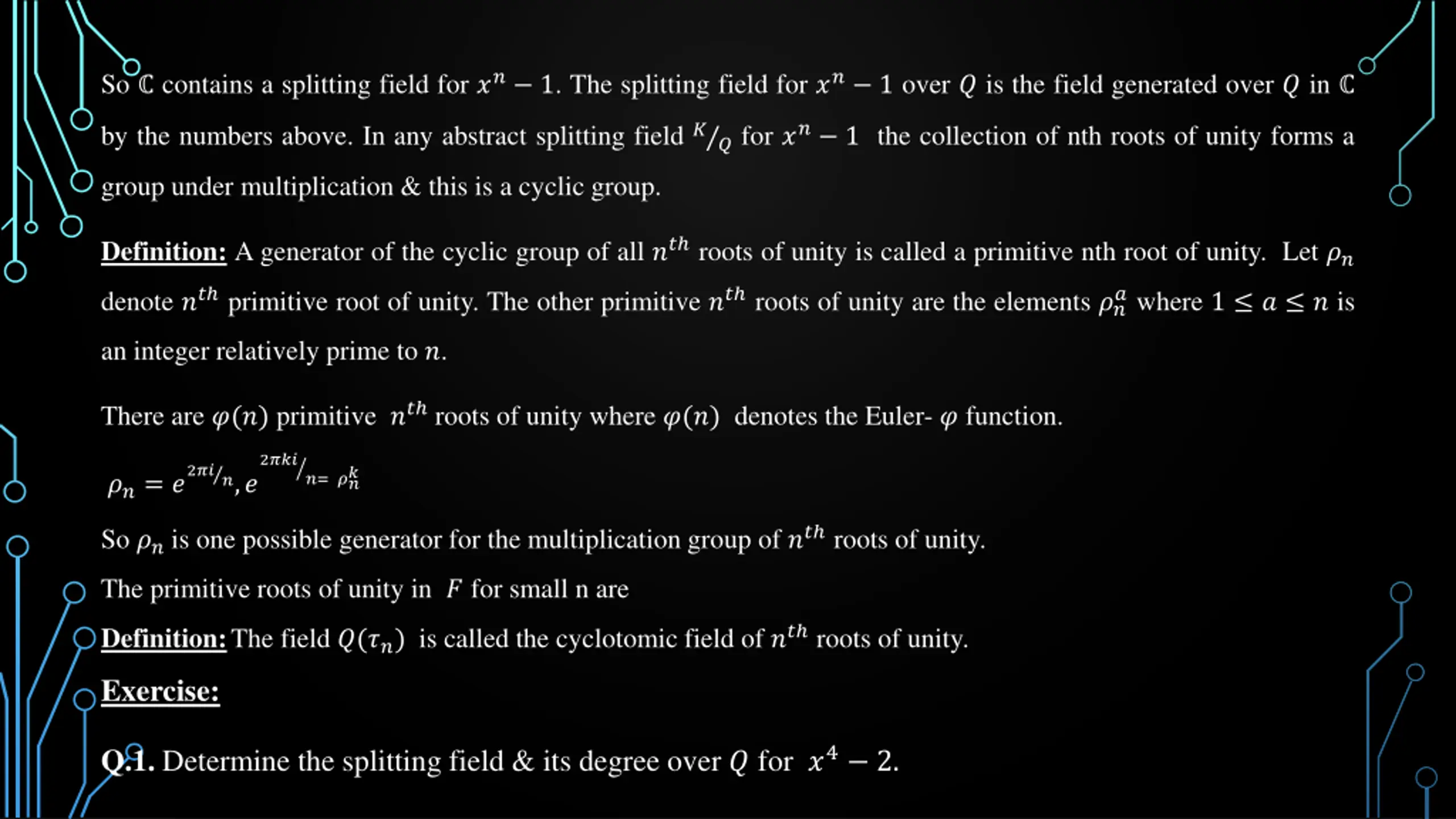 So contains a splitting field for ?? 1. The splitting field for ?? 1 over ? is the field generated over ? in ? for ?? 1 the collection of nth roots of unity forms a by the numbers above. In any abstract splitting field ? group under multiplication & this is a cyclic group. Definition: A generator of the cyclic group of all ?? roots of unity is called a primitive nth root of unity. Let ?? denote ?? primitive root of unity. The other primitive ?? roots of unity are the elements ?? ? where 1 ? ? is an integer relatively prime to ?. There are ?(?) primitive ?? roots of unity where ?(?) denotes the Euler-? function. 2??? 2???,? ? ??= ? ?= ?? So ??is one possible generator for the multiplication group of ?? roots of unity. The primitive roots of unity in ? for small n are Definition:The field ?(??) is called the cyclotomic field of ?? roots of unity. Exercise: Q.1. Determine the splitting field & its degree over ? for ?4 2.