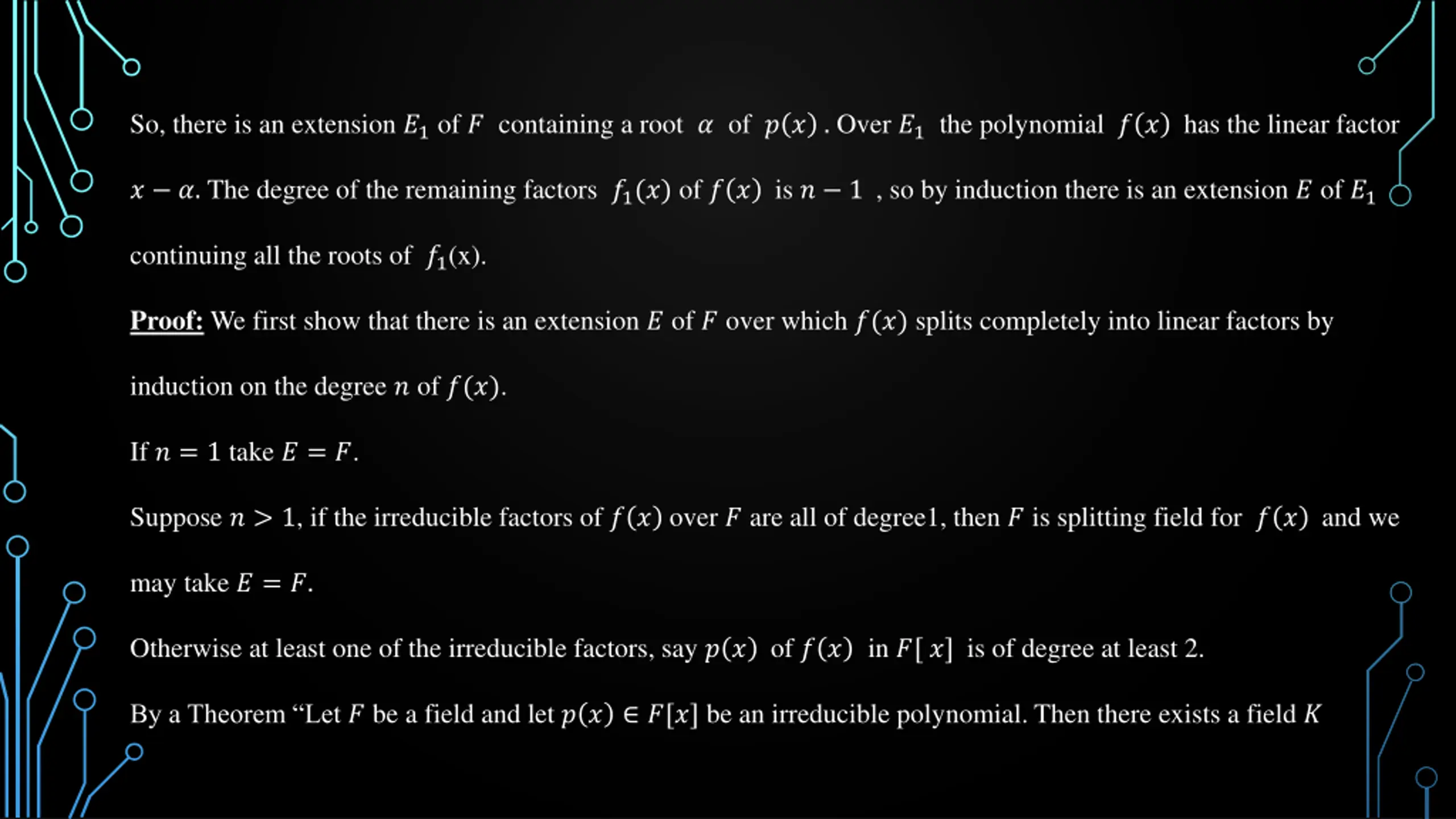 So, there is an extension ?1 of ? containing a root ? of ? ? . Over ?1 the polynomial ? ? has the linear factor ? ?. The degree of the remaining factors ?1(?) of ? ? is ? 1 , so by induction there is an extension ? of ?1 continuing all the roots of ?1(x). Proof: We first show that there is an extension ? of ? over which ?(?) splits completely into linear factors by induction on the degree ? of ?(?). If ? = 1 take ? = ?. Suppose ? > 1, if the irreducible factors of ? ? over ? are all of degree1, then ? is splitting field for ? ? and we may take ? = ?. Otherwise at least one of the irreducible factors, say ? ? of ? ? in ?[ ?] is of degree at least 2. By a Theorem Let ? be a field and let ? ? ?[?] be an irreducible polynomial. Then there exists a field ?