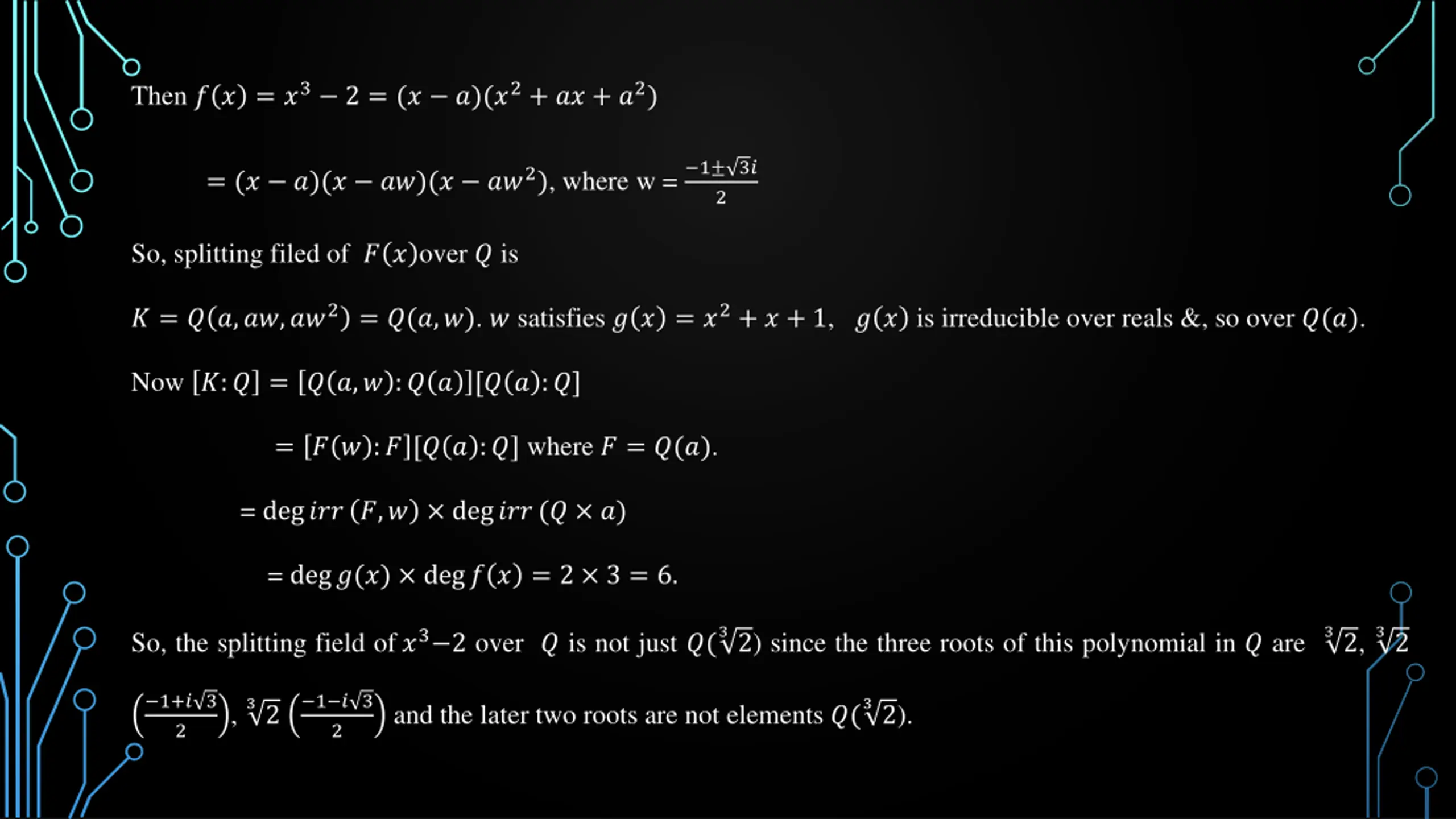 Then ? ? = ?3 2 = (? ?)(?2+ ?? + ?2) = (? ?)(? ??)(? ??2), where w = 1 3? 2 So, splitting filed of ? ? over ? is ? = ? ?,??,??2= ?(?,?). ? satisfies ? ? = ?2+ ? + 1, ? ? is irreducible over reals &, so over ?(?). Now ?:? = ? ?,? :? ? [? ? :?] = ? ? :? [? ? :?] where ? = ?(?). = deg??? ?,? deg???(? ?) = deg?(?) deg? ? = 2 3 = 6. 32) since the three roots of this polynomial in ? are 32, 32 So, the splitting field of ?3 2 over ? is not just ?( 1+? 3 2 1 ? 3 2 32 32). , and the later two roots are not elements ?(