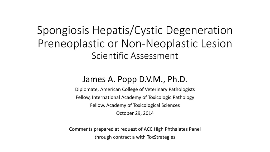 Spongiosis Hepatis/Cystic Degeneration Preneoplastic or Non-Neoplastic Lesion Scientific Assessment James A. Popp D.V.M., Ph.D. Diplomate, American College of Veterinary Pathologists Fellow, International Academy of Toxicologic Pathology Fellow, Academy of Toxicological Sciences October 29, 2014 Comments prepared at request of ACC High Phthalates Panel through contract a with ToxStrategies