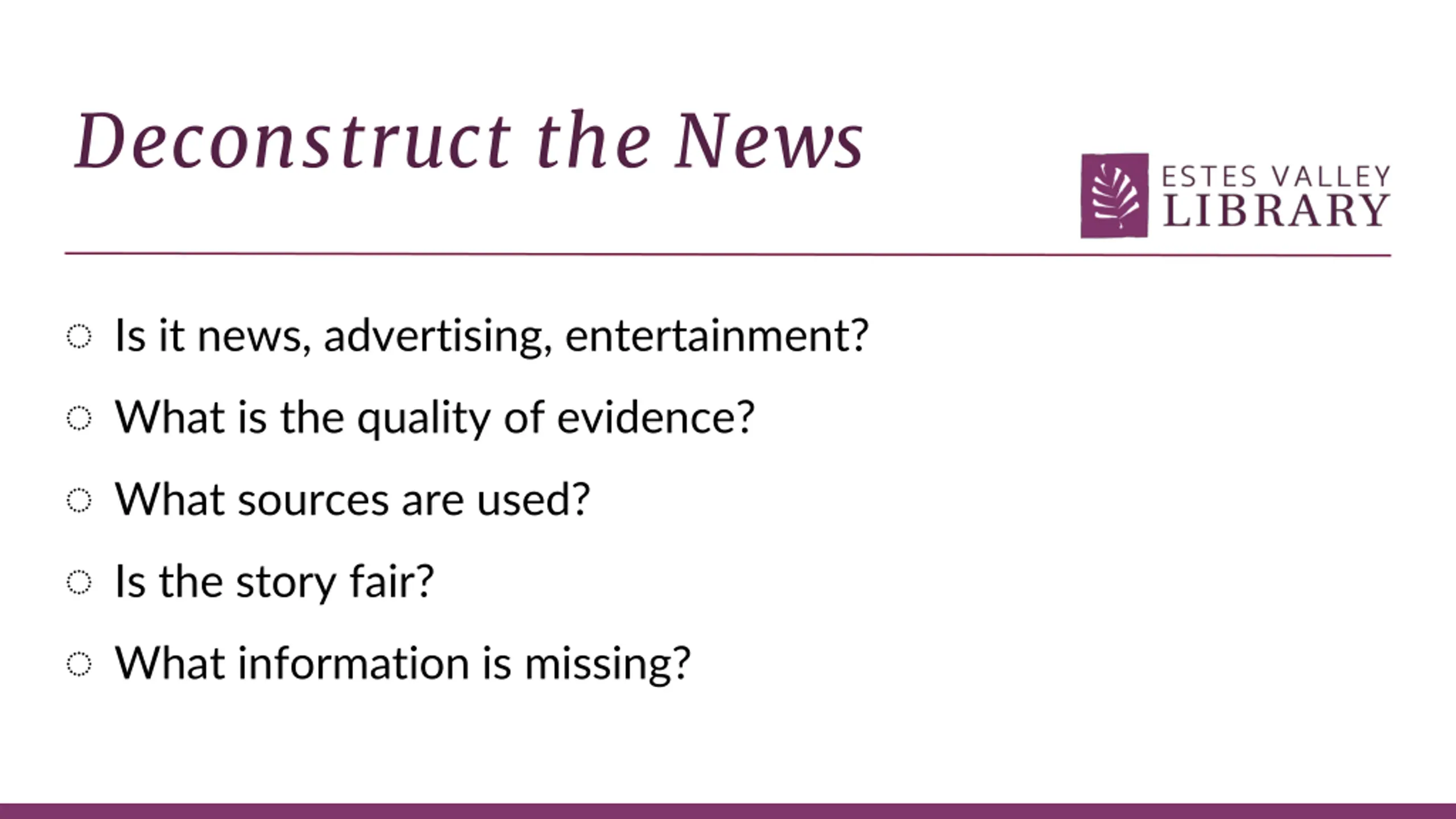 Deconstruct the News Is it news, advertising, entertainment? What is the quality of evidence? What sources are used? Is the story fair? What information is missing?