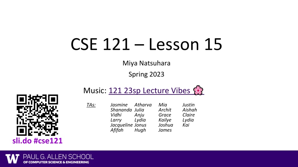 CSE 121 Lesson 15 Miya Natsuhara Spring 2023 Music: 121 23sp Lecture Vibes TAs: Jasmine Shananda Vidhi Larry Jacqueline Afifah Atharva Julia Anju Lydia Jonus Hugh Mia Archit Grace Kailye Joshua James Justin Aishah Claire Lydia Kai sli.do #cse121