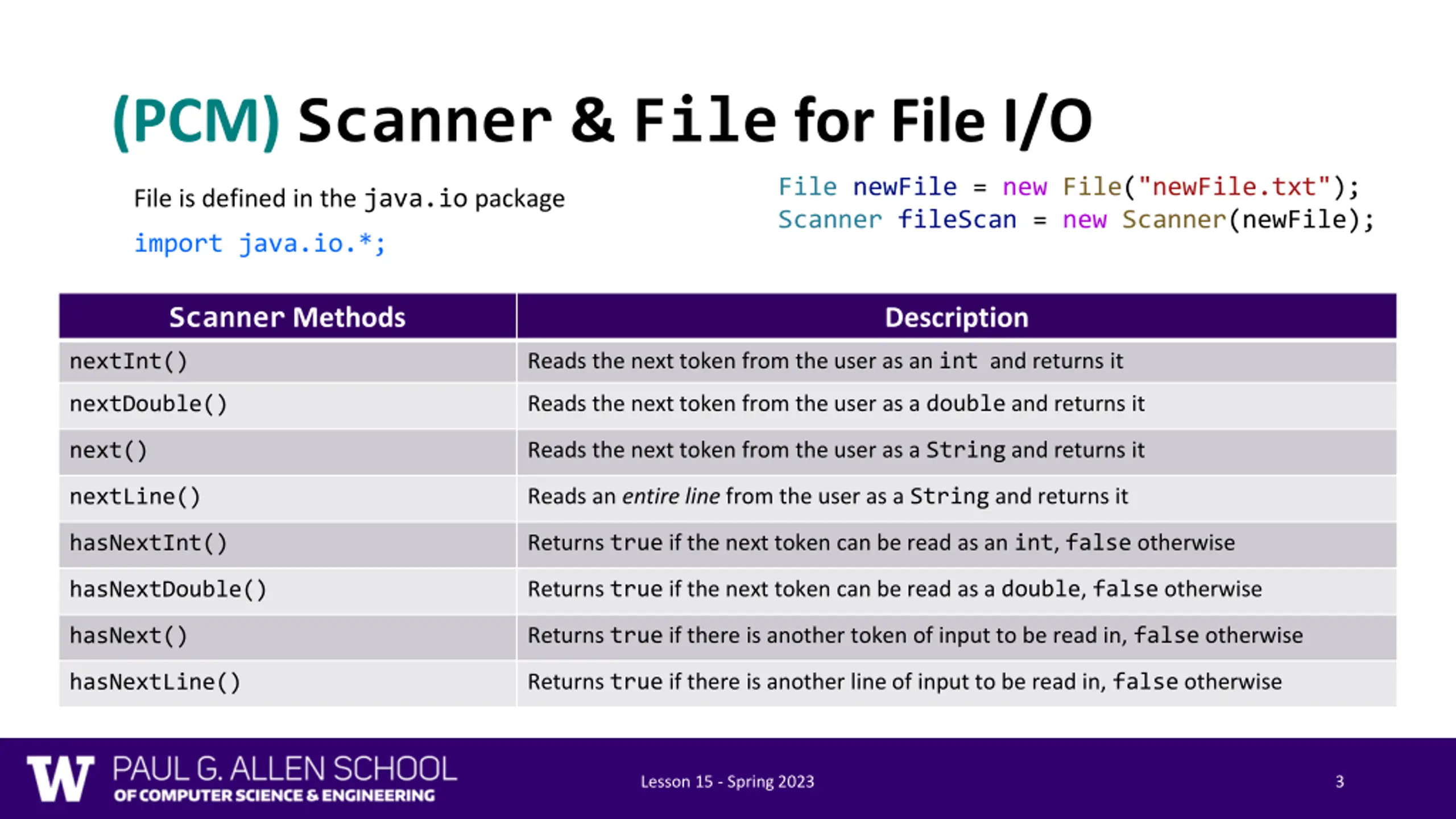 (PCM) Scanner & File for File I/O File newFile = new File("newFile.txt"); Scanner fileScan = new Scanner(newFile); File is defined in the java.io package import java.io.*; Scanner Methods Description Reads the next token from the user as an int and returns it nextInt() Reads the next token from the user as a double and returns it nextDouble() Reads the next token from the user as a String and returns it next() Reads an entire line from the user as a String and returns it nextLine() Returns true if the next token can be read as an int, false otherwise hasNextInt() Returns true if the next token can be read as a double, false otherwise hasNextDouble() Returns true if there is another token of input to be read in, false otherwise hasNext() Returns true if there is another line of input to be read in, false otherwise hasNextLine() Lesson 15 - Spring 2023 3