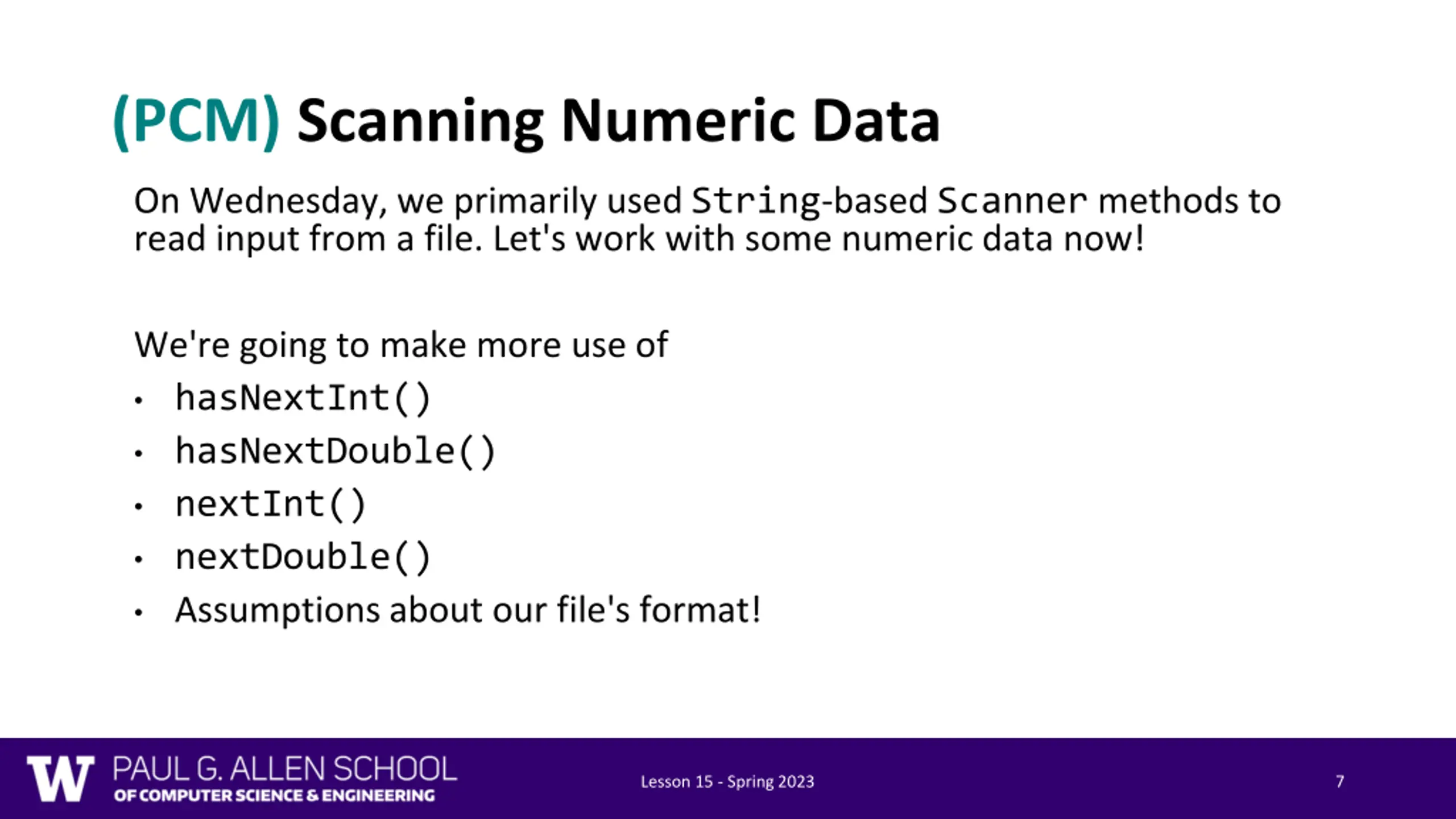 (PCM) Scanning Numeric Data On Wednesday, we primarily used String-based Scanner methods to read input from a file. Let's work with some numeric data now! We're going to make more use of hasNextInt() hasNextDouble() nextInt() nextDouble() Assumptions about our file's format! Lesson 15 - Spring 2023 7