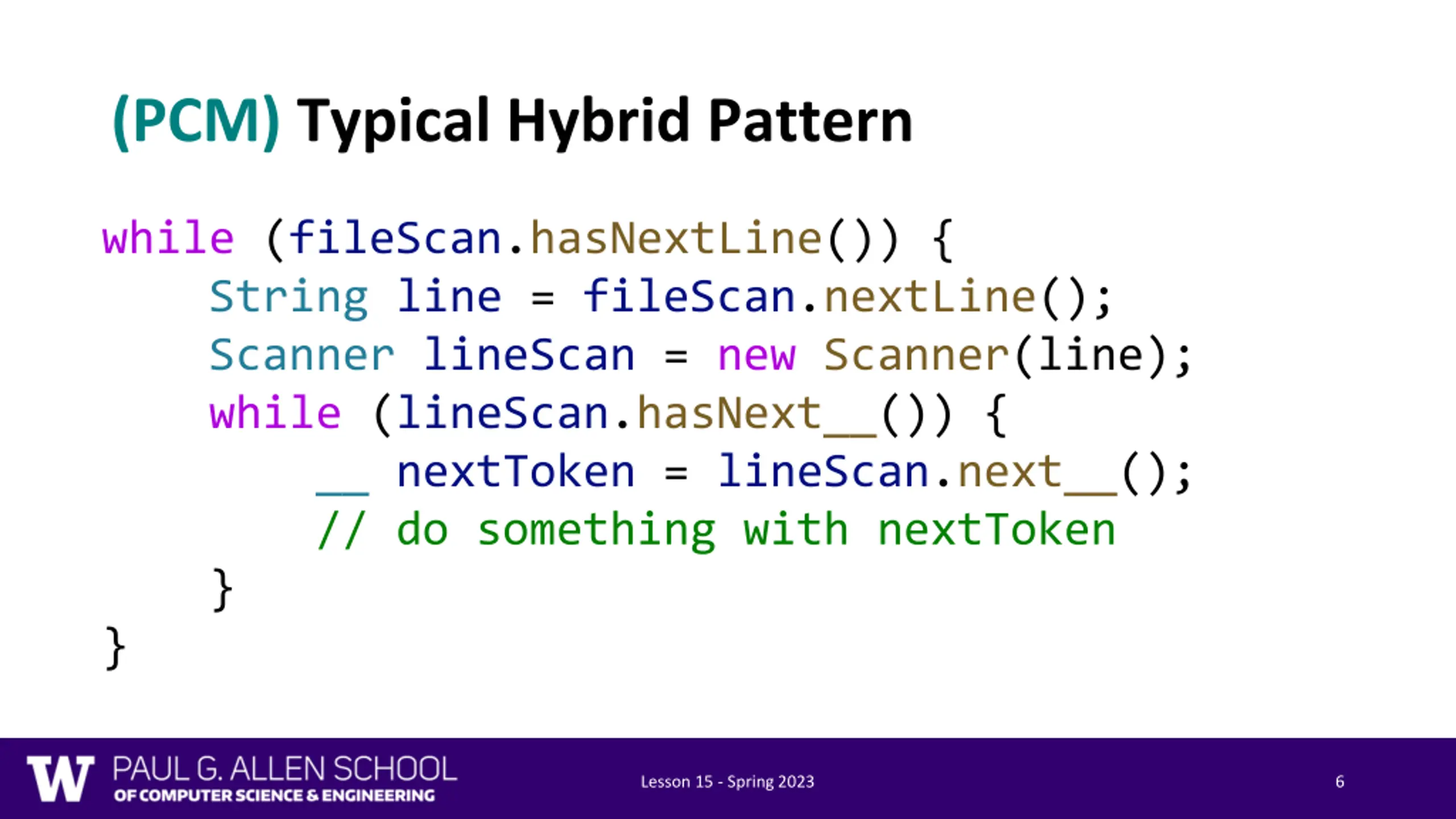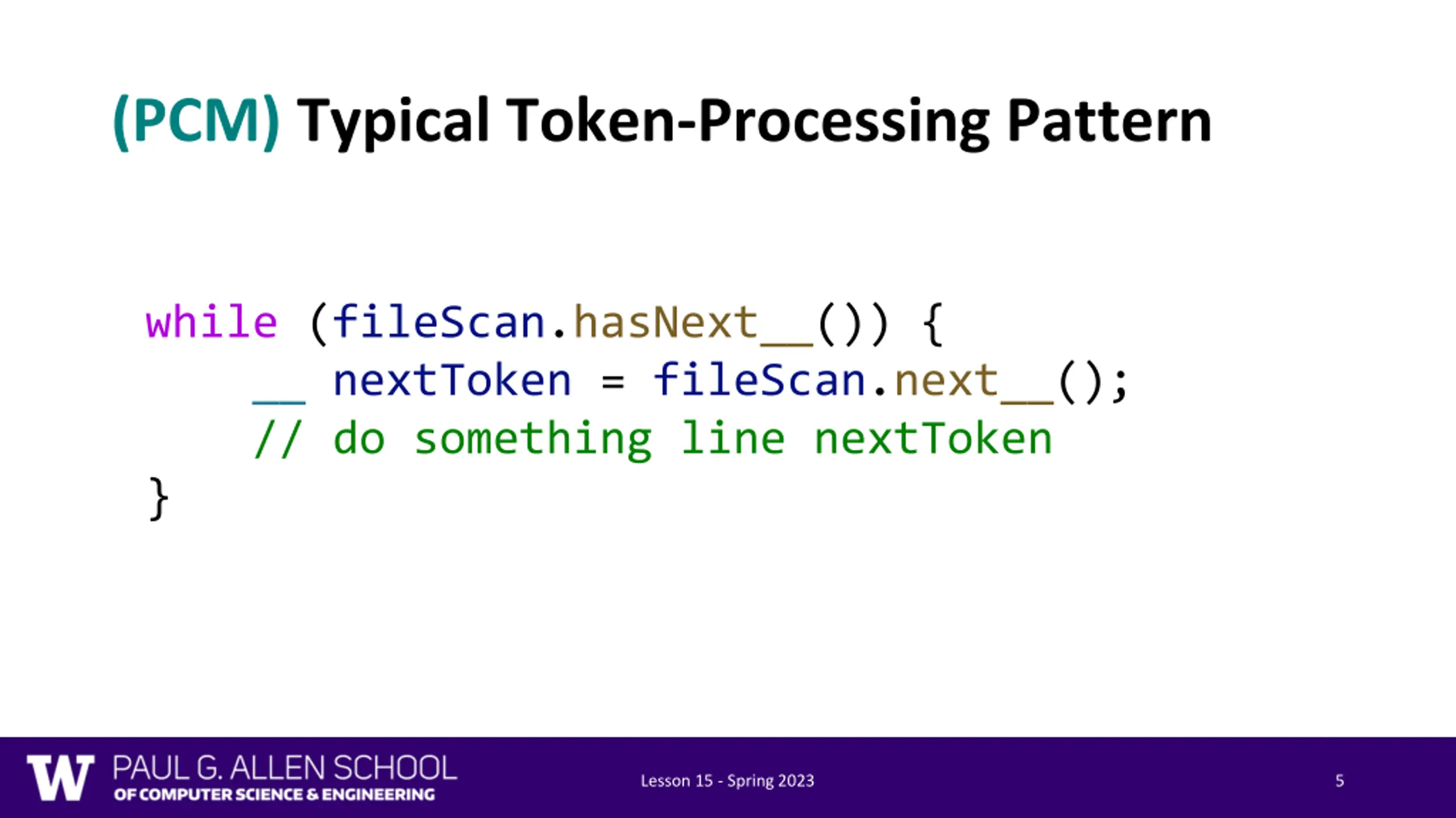(PCM) Typical Token-Processing Pattern while (fileScan.hasNext__()) { __ nextToken = fileScan.next__(); // do something line nextToken } Lesson 15 - Spring 2023 5