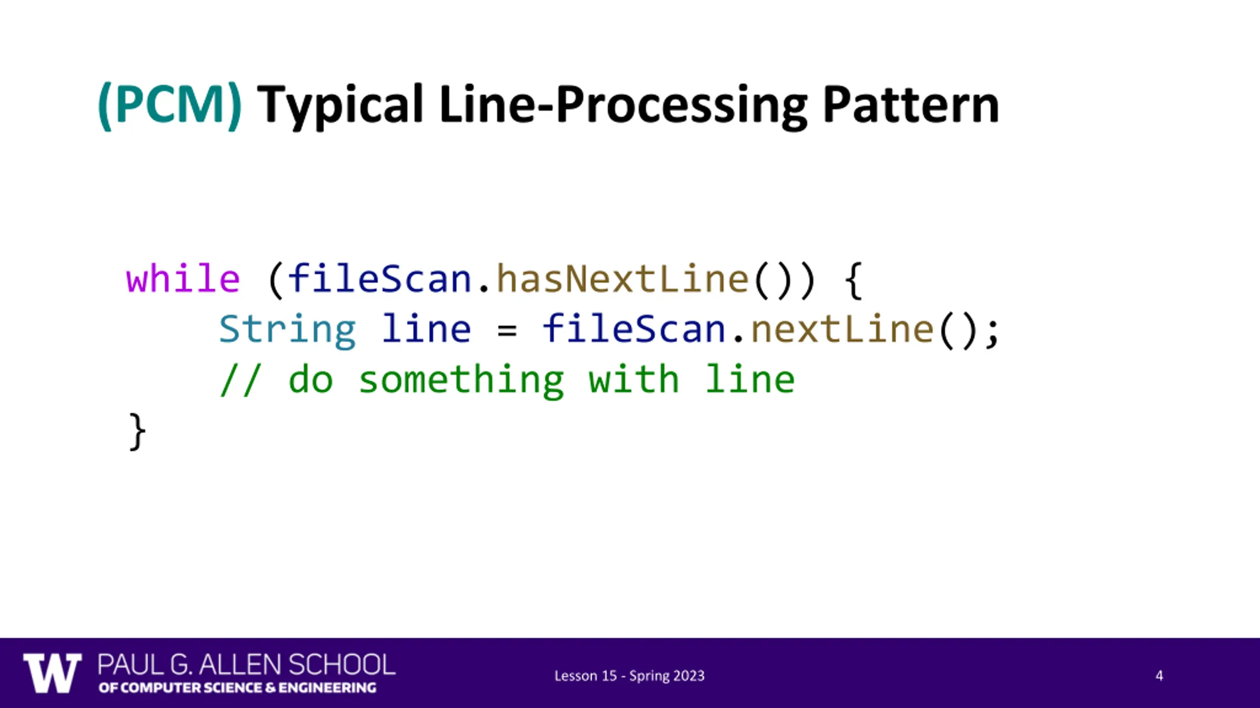 (PCM) Typical Line-Processing Pattern while (fileScan.hasNextLine()) { String line = fileScan.nextLine(); // do something with line } Lesson 15 - Spring 2023 4