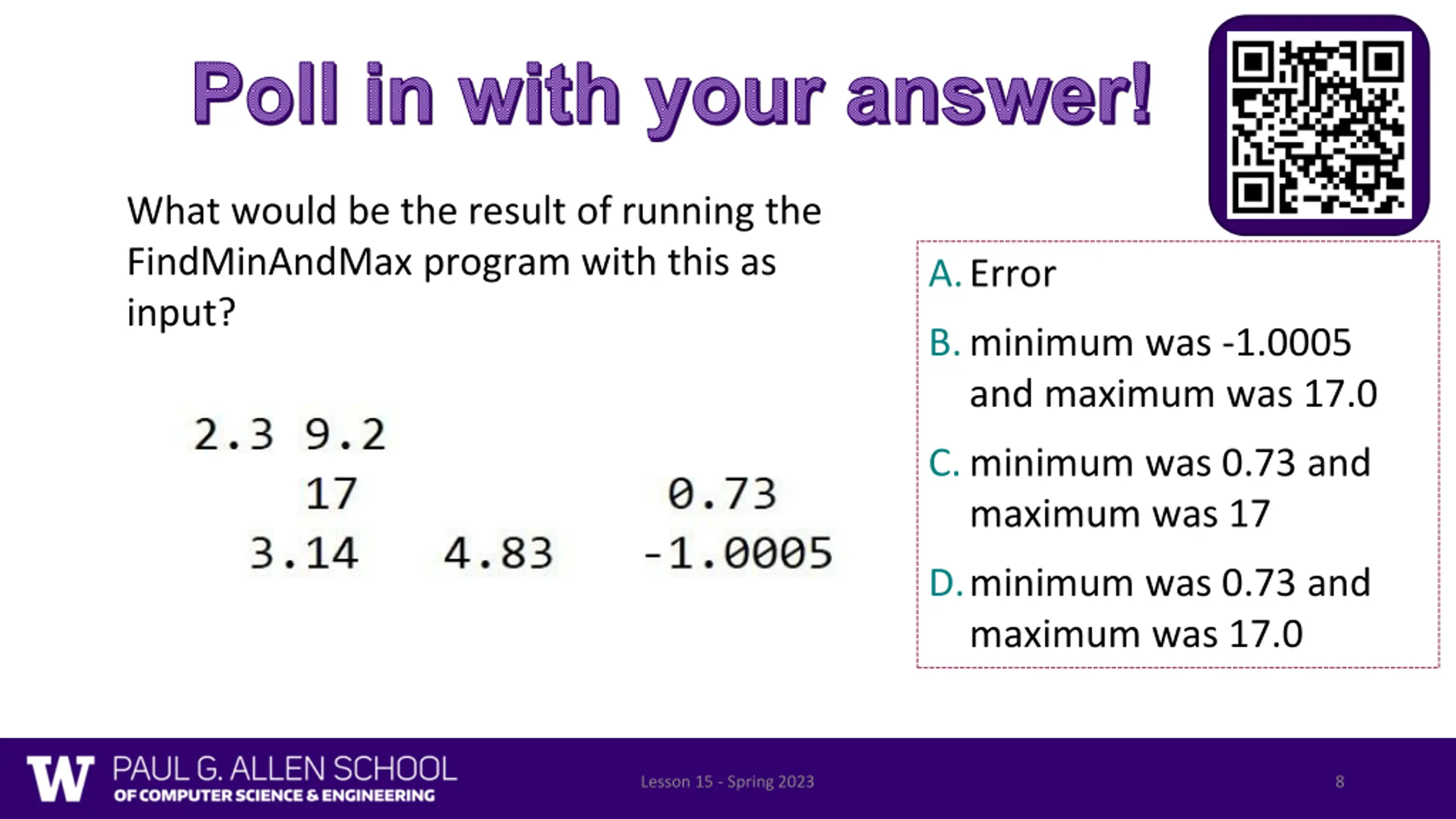 Poll in with your answer! What would be the result of running the FindMinAndMax program with this as input? A.Error B.minimum was -1.0005 and maximum was 17.0 C.minimum was 0.73 and maximum was 17 D.minimum was 0.73 and maximum was 17.0 Lesson 15 - Spring 2023 8