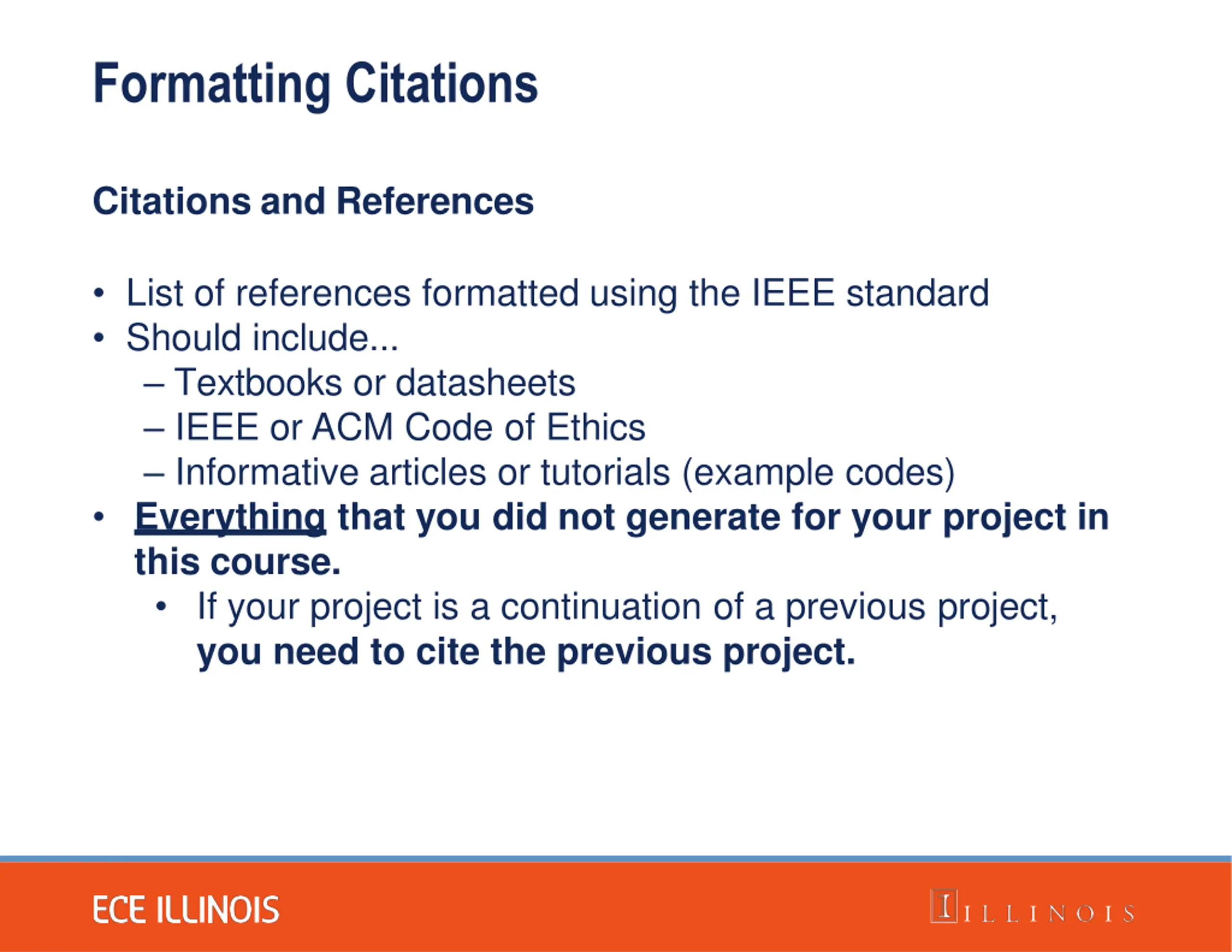 Formatting Citations Citations and References List of references formatted using the IEEE standard Should include... Textbooks or datasheets IEEE or ACM Code of Ethics Informative articles or tutorials (example codes) Everything that you did not generate for your project in this course. If your project is a continuation of a previous project, you need to cite the previous project.