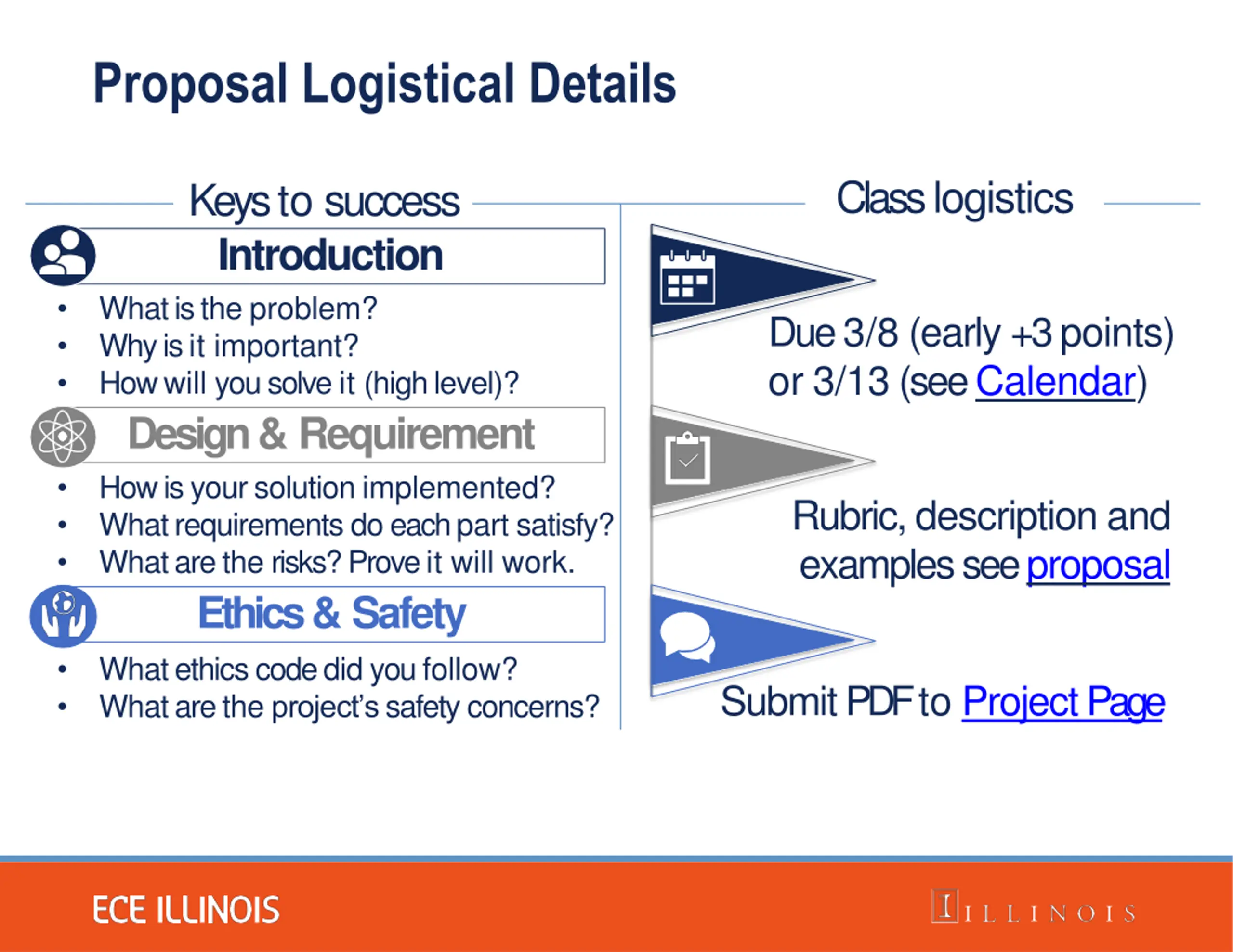 "Learn about the proposal logistics for ECE 445/ME470.ZJUI in Spring 2023, including early submission deadlines, key elements like problem identification and solution design, ethics and safety considerations, and formatting citations. Get insights on how to craft an effective proposal for this course project."