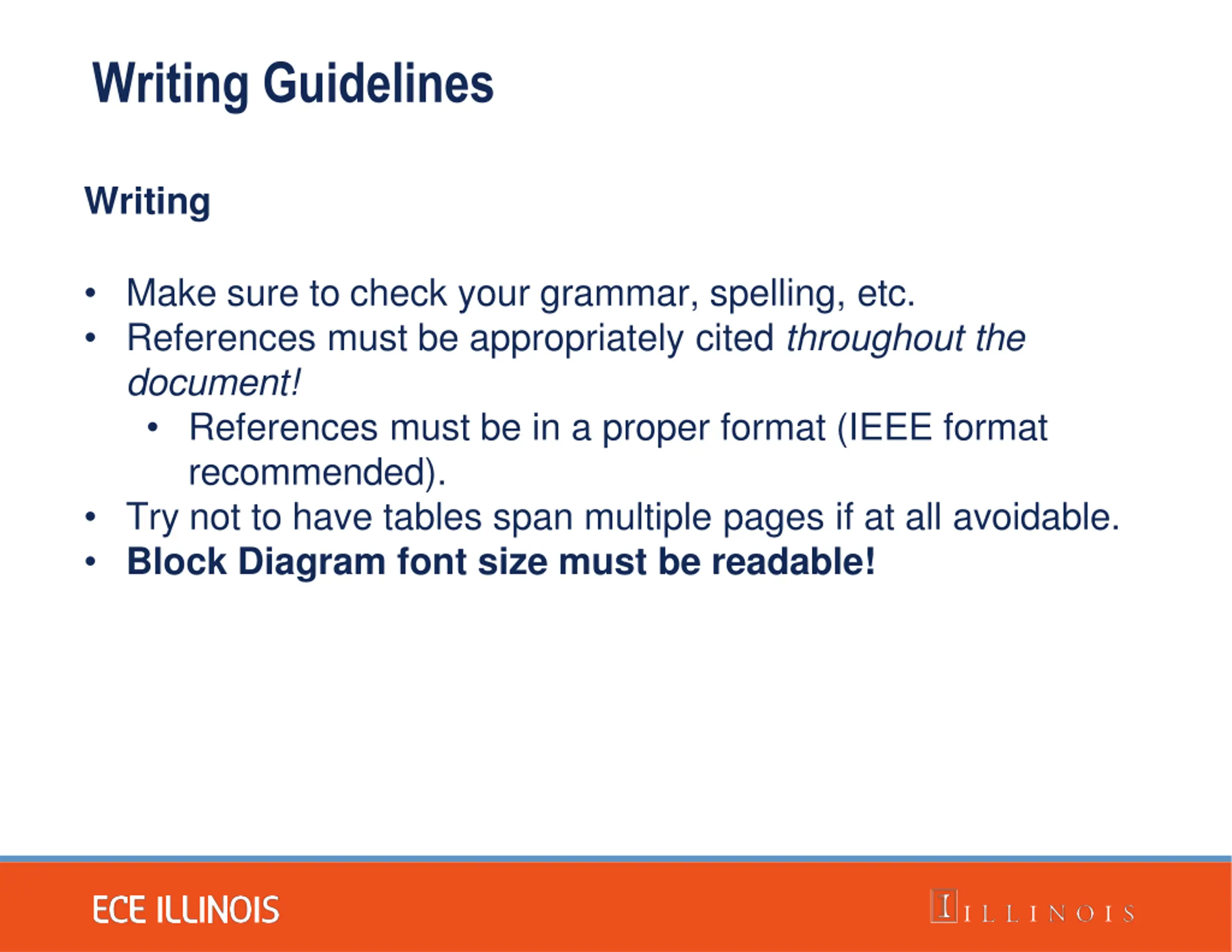 Writing Guidelines Writing Make sure to check your grammar, spelling, etc. References must be appropriately cited throughout the document! References must be in a proper format (IEEE format recommended). Try not to have tables span multiple pages if at all avoidable. Block Diagram font size must be readable!