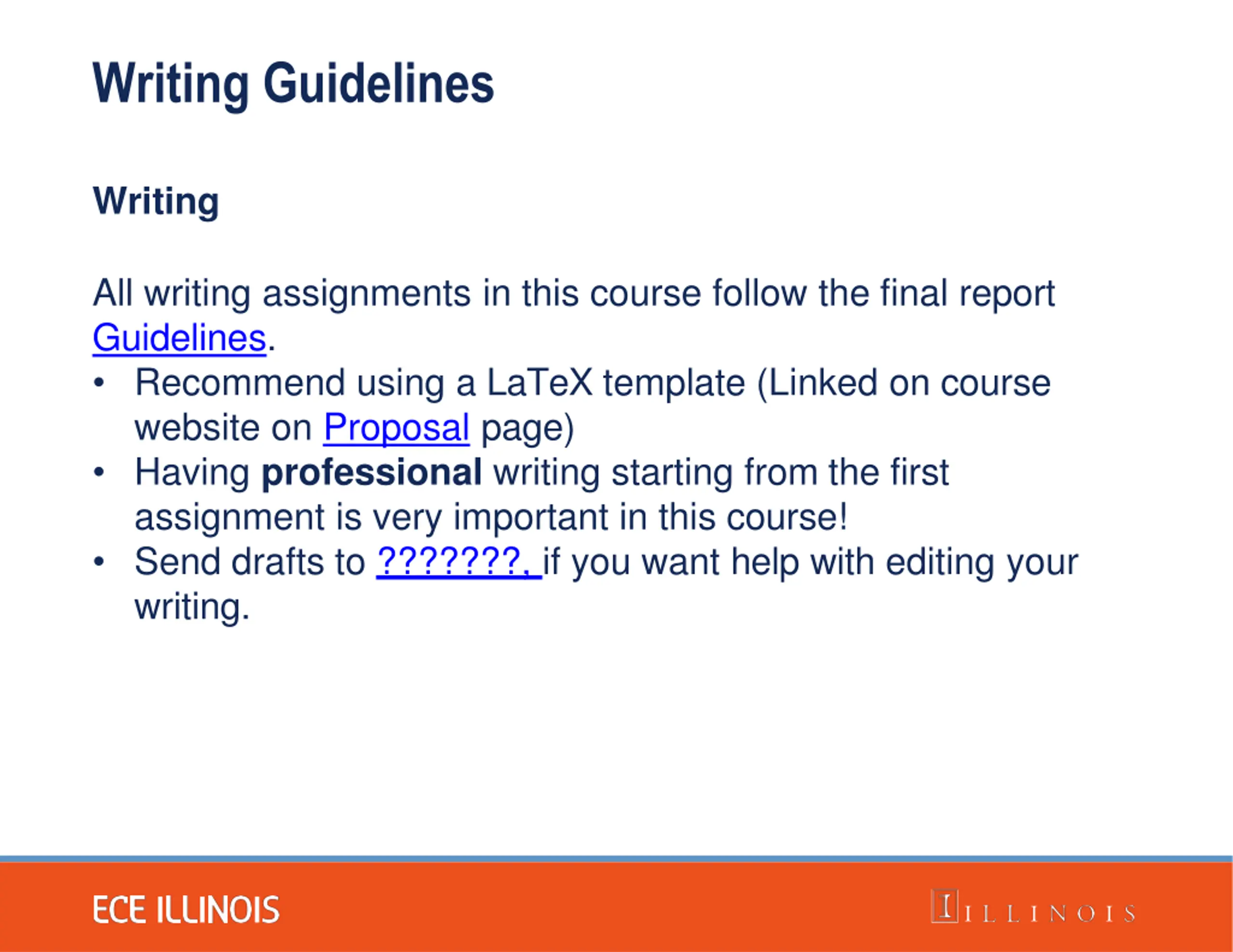 Writing Guidelines Writing All writing assignments in this course follow the final report Guidelines. Recommend using a LaTeX template (Linked on course website on Proposal page) Having professional writing starting from the first assignment is very important in this course! Send drafts to ???????, if you want help with editing your writing.