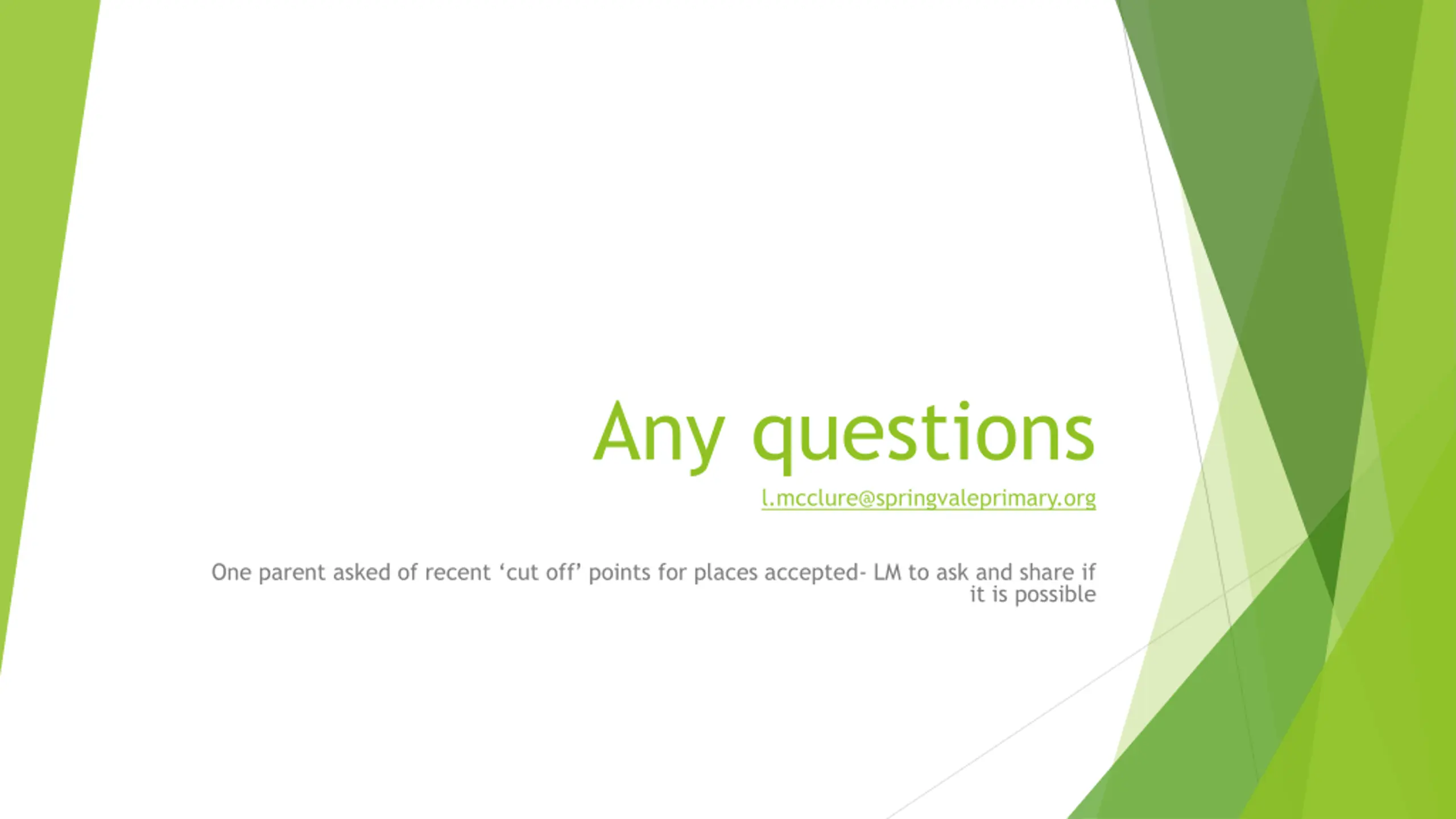 Any questions l.mcclure@springvaleprimary.org One parent asked of recent cut off points for places accepted- LM to ask and share if it is possible