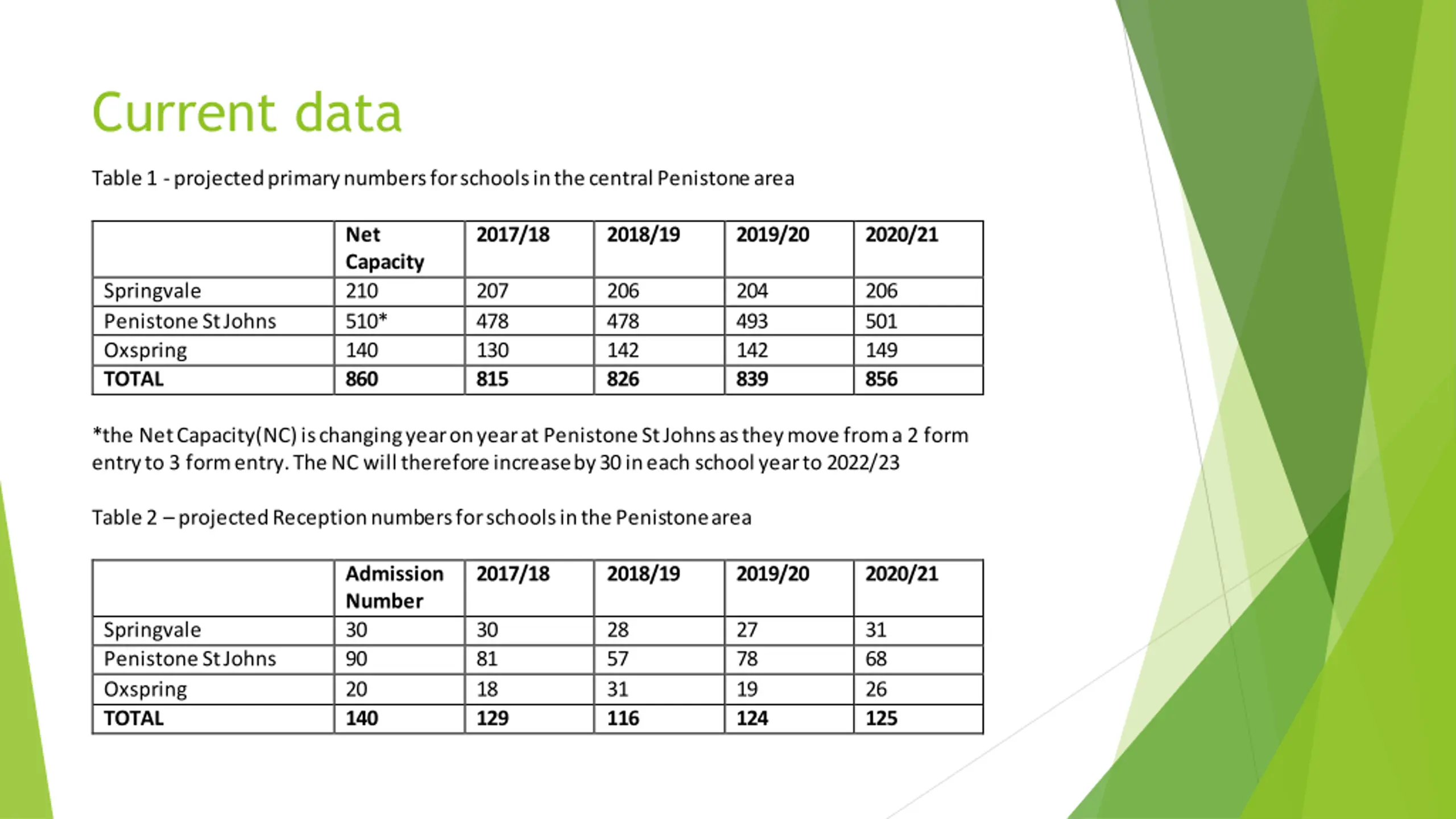 Current data Table 1 - projected primary numbers for schools in the central Penistone area Net Capacity Springvale 210 Penistone St Johns 510* Oxspring 140 TOTAL 860 *the Net Capacity(NC) is changing year on year at Penistone St Johns as they move from a 2 form entry to 3 form entry. The NC will therefore increase by 30 in each school year to 2022/23 Table 2 projected Reception numbers for schools in the Penistone area Admission Number Springvale 30 30 Penistone St Johns 90 81 Oxspring 20 18 TOTAL 140 129 2017/18 2018/19 2019/20 2020/21 207 478 130 815 206 478 142 826 204 493 142 839 206 501 149 856 2017/18 2018/19 2019/20 2020/21 28 57 31 116 27 78 19 124 31 68 26 125
