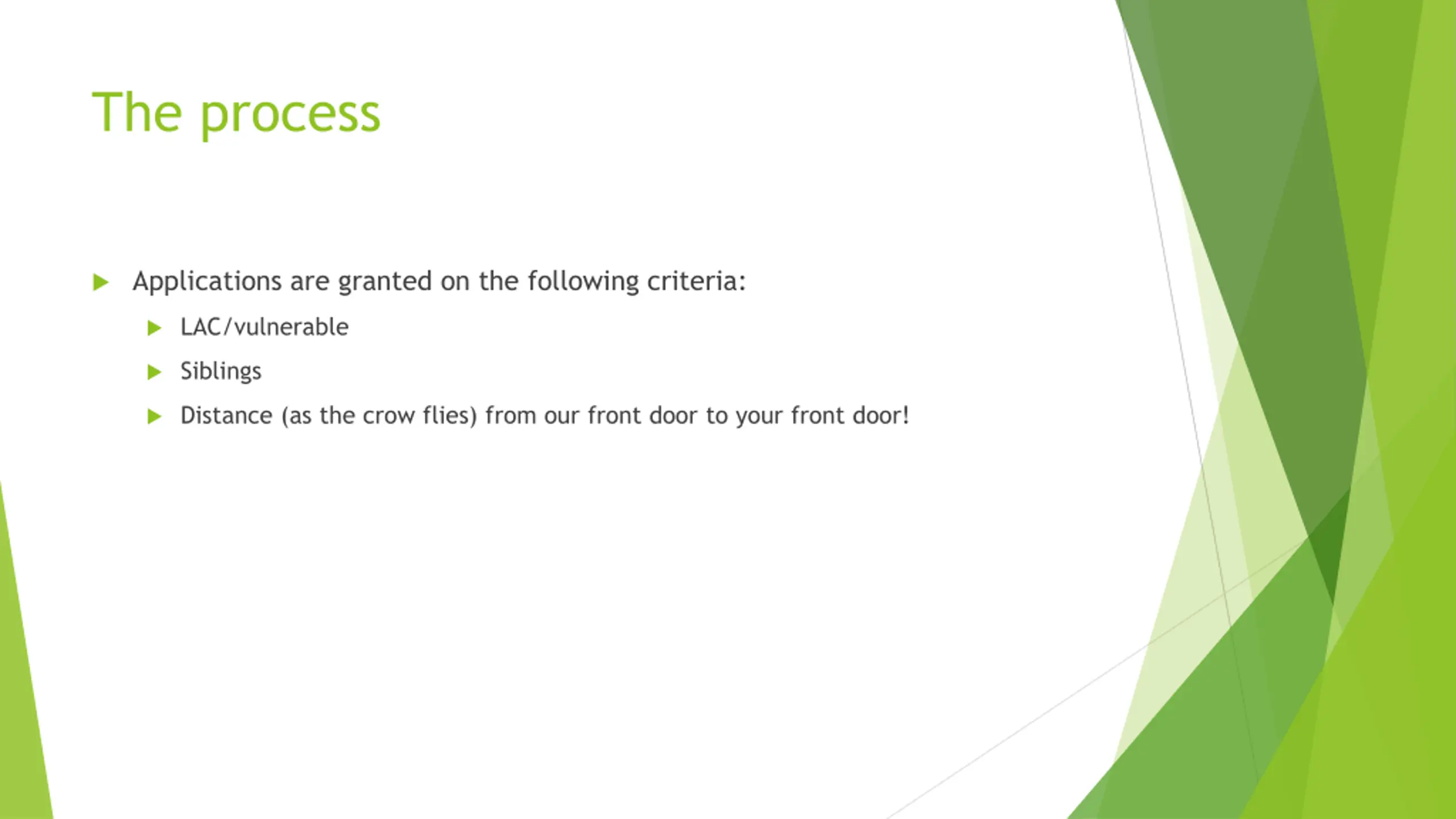 The process Applications are granted on the following criteria: LAC/vulnerable Siblings Distance (as the crow flies) from our front door to your front door!