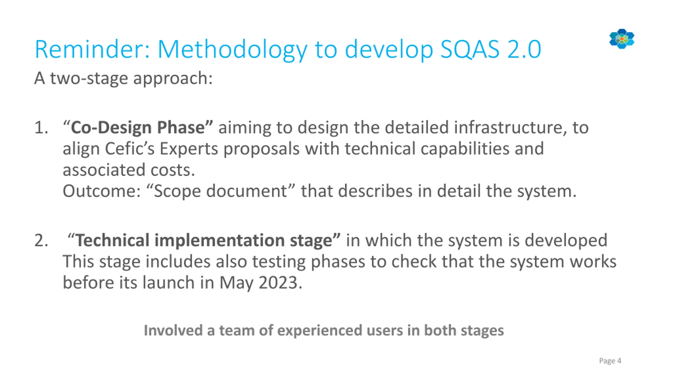 Reminder: Methodology to develop SQAS 2.0 A two-stage approach: 1. Co-Design Phase aiming to design the detailed infrastructure, to align Cefic s Experts proposals with technical capabilities and associated costs. Outcome: Scope document that describes in detail the system. 2. Technical implementation stage in which the system is developed This stage includes also testing phases to check that the system works before its launch in May 2023. Involved a team of experienced users in both stages Page 4