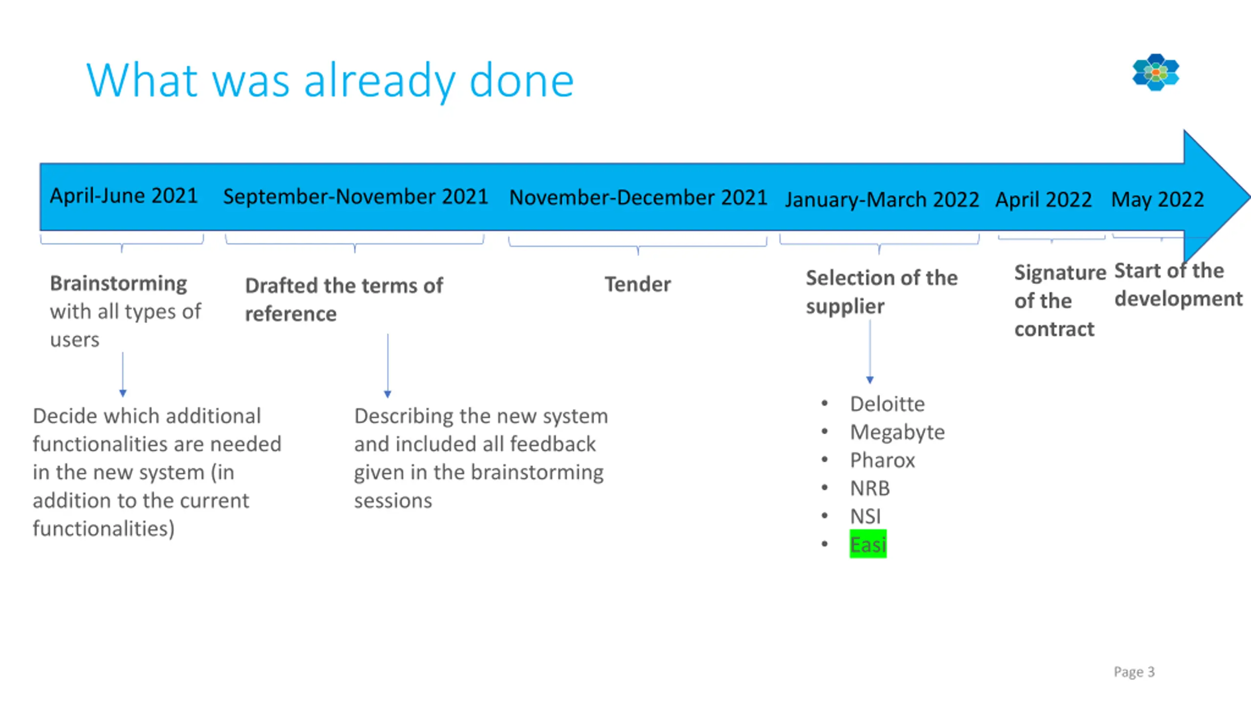 What was already done April-June 2021 September-November 2021 November-December 2021 May 2022 January-March 2022 April 2022 Start of the development Signature of the contract Selection of the supplier Brainstorming with all types of users Tender Drafted the terms of reference Deloitte Megabyte Pharox NRB NSI Easi Decide which additional functionalities are needed in the new system (in addition to the current functionalities) Describing the new system and included all feedback given in the brainstorming sessions Page 3