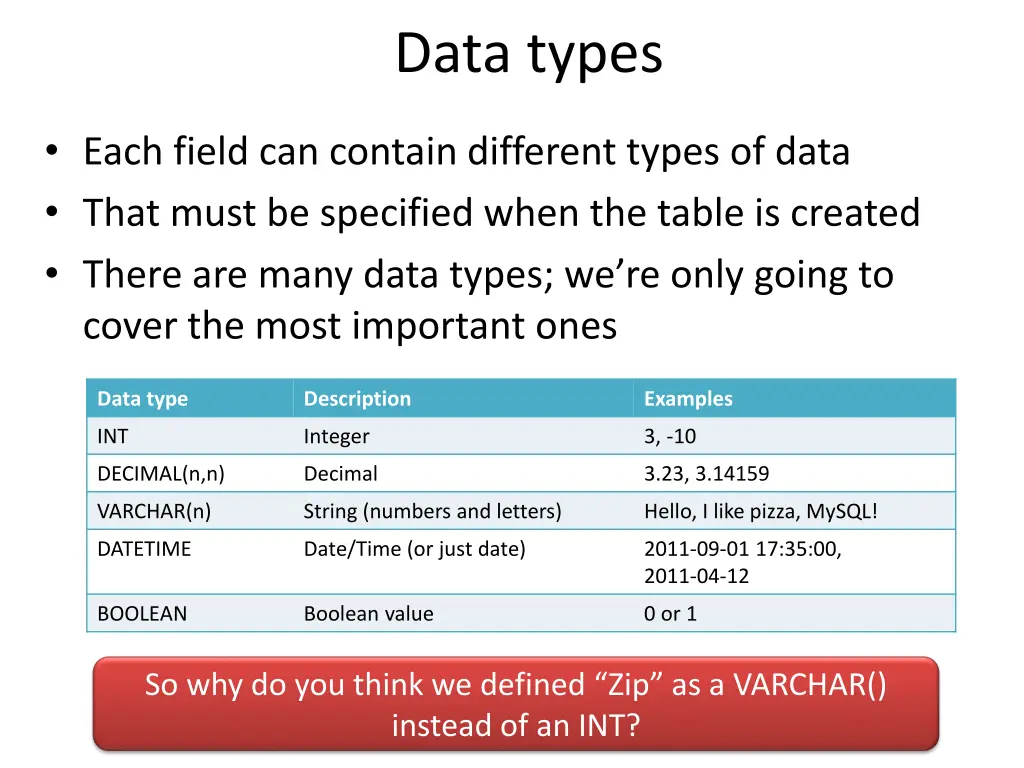Data types Each field can contain different types of data That must be specified when the table is created There are many data types; we re only going to cover the most important ones Data type Description Examples INT Integer 3, -10 DECIMAL(n,n) Decimal 3.23, 3.14159 VARCHAR(n) String (numbers and letters) Hello, I like pizza, MySQL! DATETIME Date/Time (or just date) 2011-09-01 17:35:00, 2011-04-12 BOOLEAN Boolean value 0 or 1 So why do you think we defined Zip as a VARCHAR() instead of an INT?