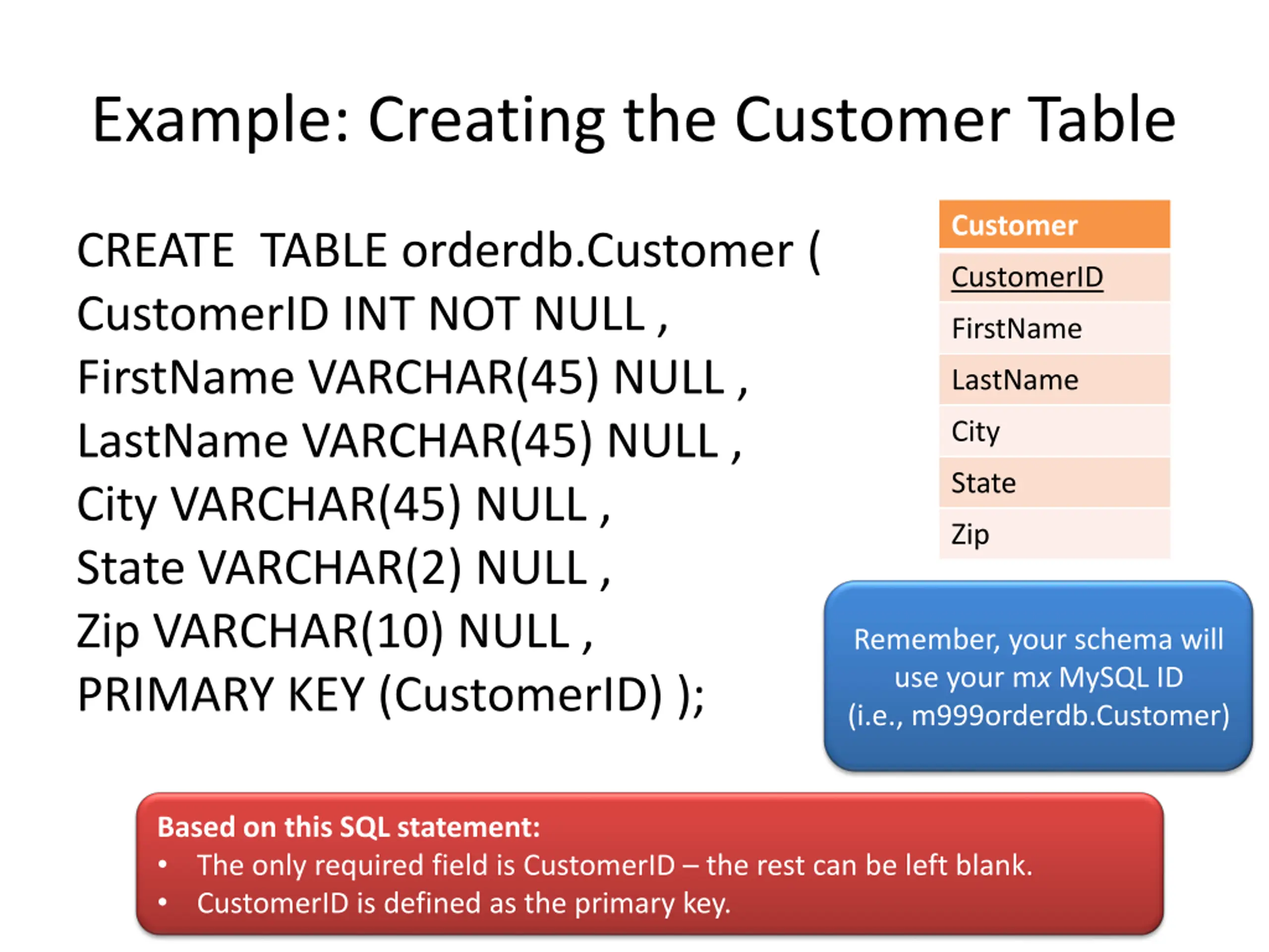 Example: Creating the Customer Table Customer CREATE TABLE orderdb.Customer ( CustomerID INT NOT NULL , FirstName VARCHAR(45) NULL , LastName VARCHAR(45) NULL , City VARCHAR(45) NULL , State VARCHAR(2) NULL , Zip VARCHAR(10) NULL , PRIMARY KEY (CustomerID) ); CustomerID FirstName LastName City State Zip Remember, your schema will use your mx MySQL ID (i.e., m999orderdb.Customer) Based on this SQL statement: The only required field is CustomerID the rest can be left blank. CustomerID is defined as the primary key.